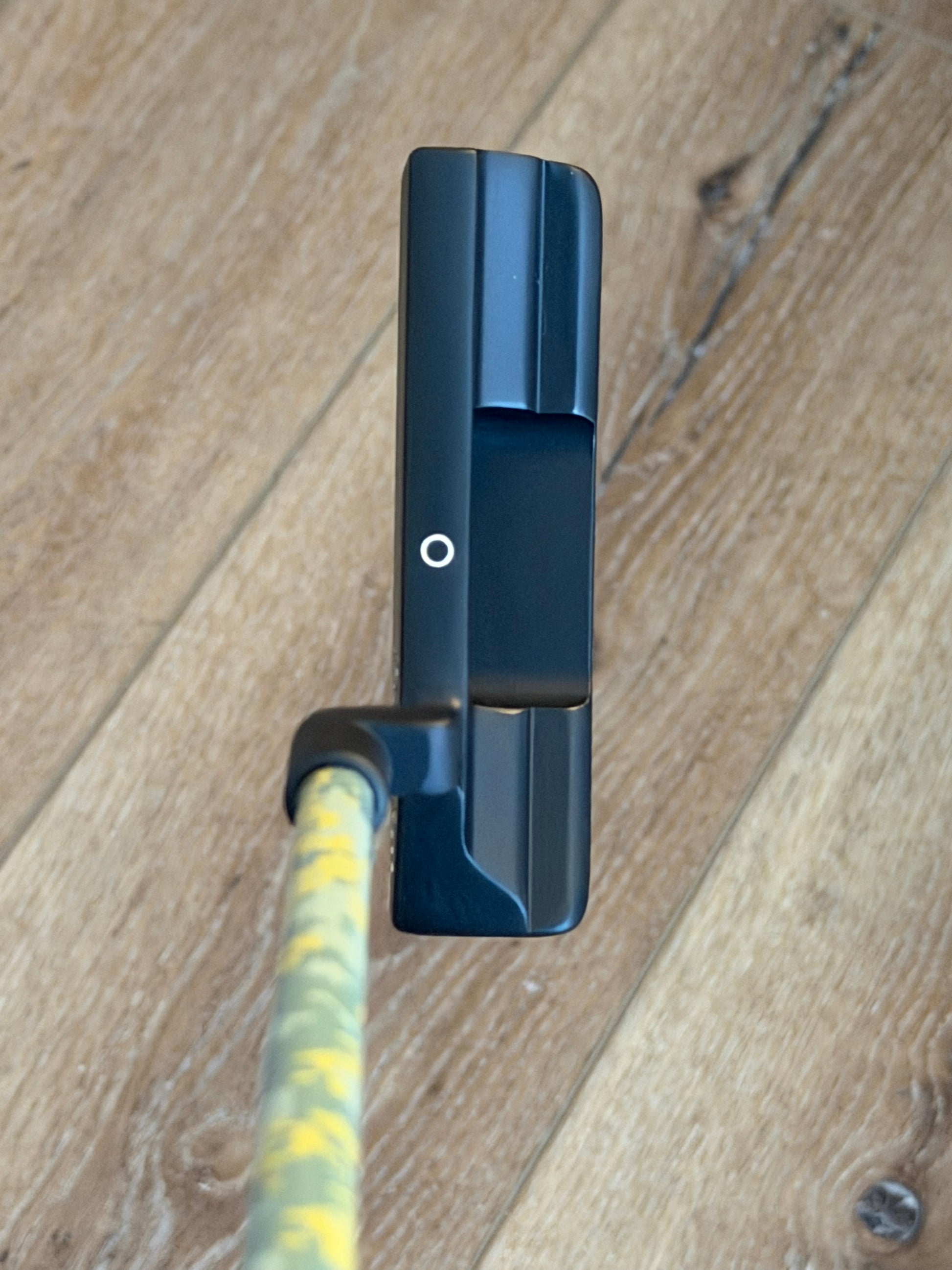 head was cleaned up and coated in anodized black. Original milling is all there. Not quite perfect but absolutely worth saving. Putter is weighted well- very little to nothing removed. I took it from its original state. This thing is stacked with high end parts and will feel absolutely awesome.
