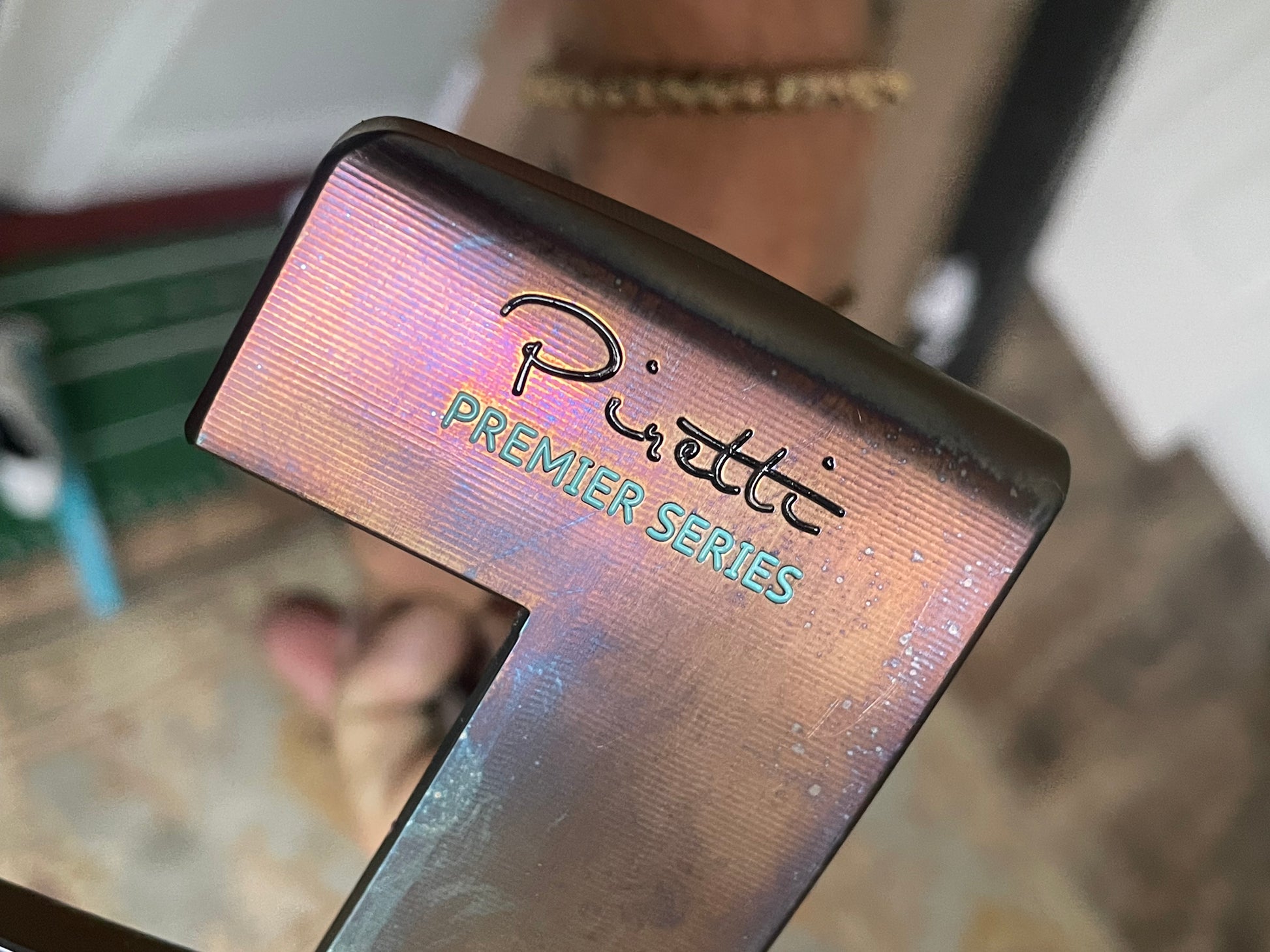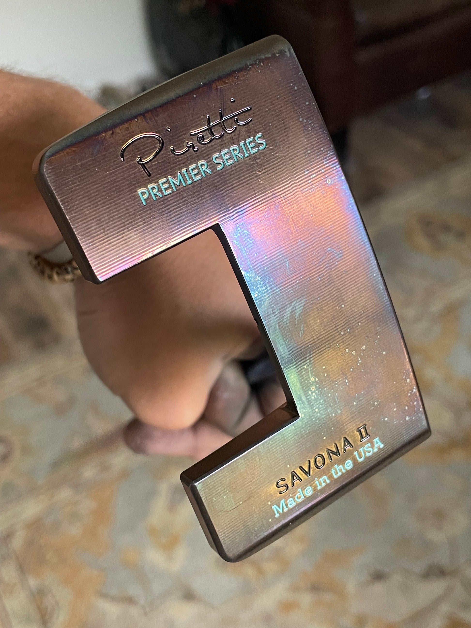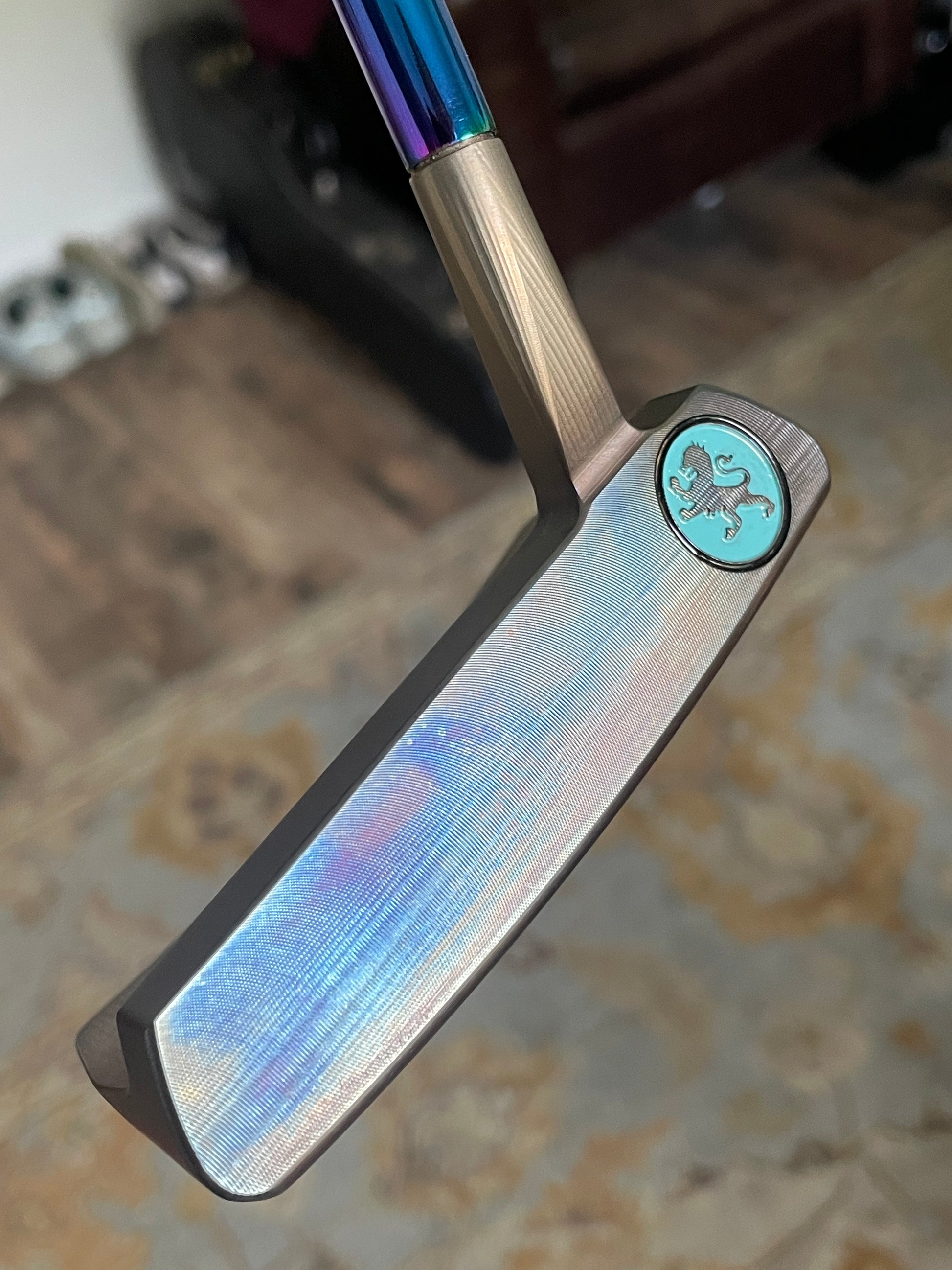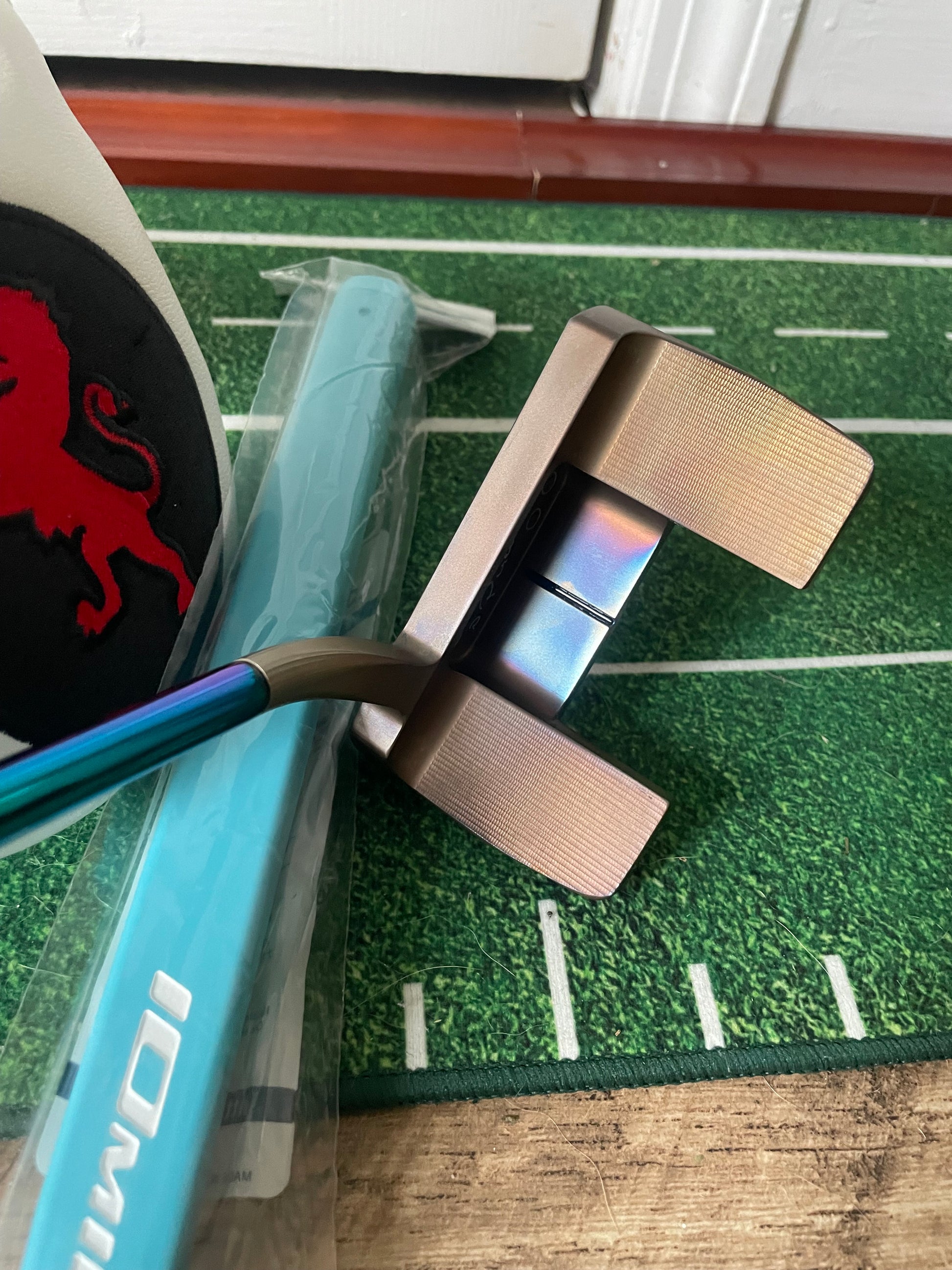 This is a new putter. A beautiful small mallet shape- torched, turquoise and black paint, on a rainbow KBS CT Tour shaft. Original magnetic cover included. Putter will play 34.5" unless I'm instructed otherwise! Message me how long you want it before or after buying. Included is a new Iomic midsize in "kinda blue" that matches this putter perfectly.