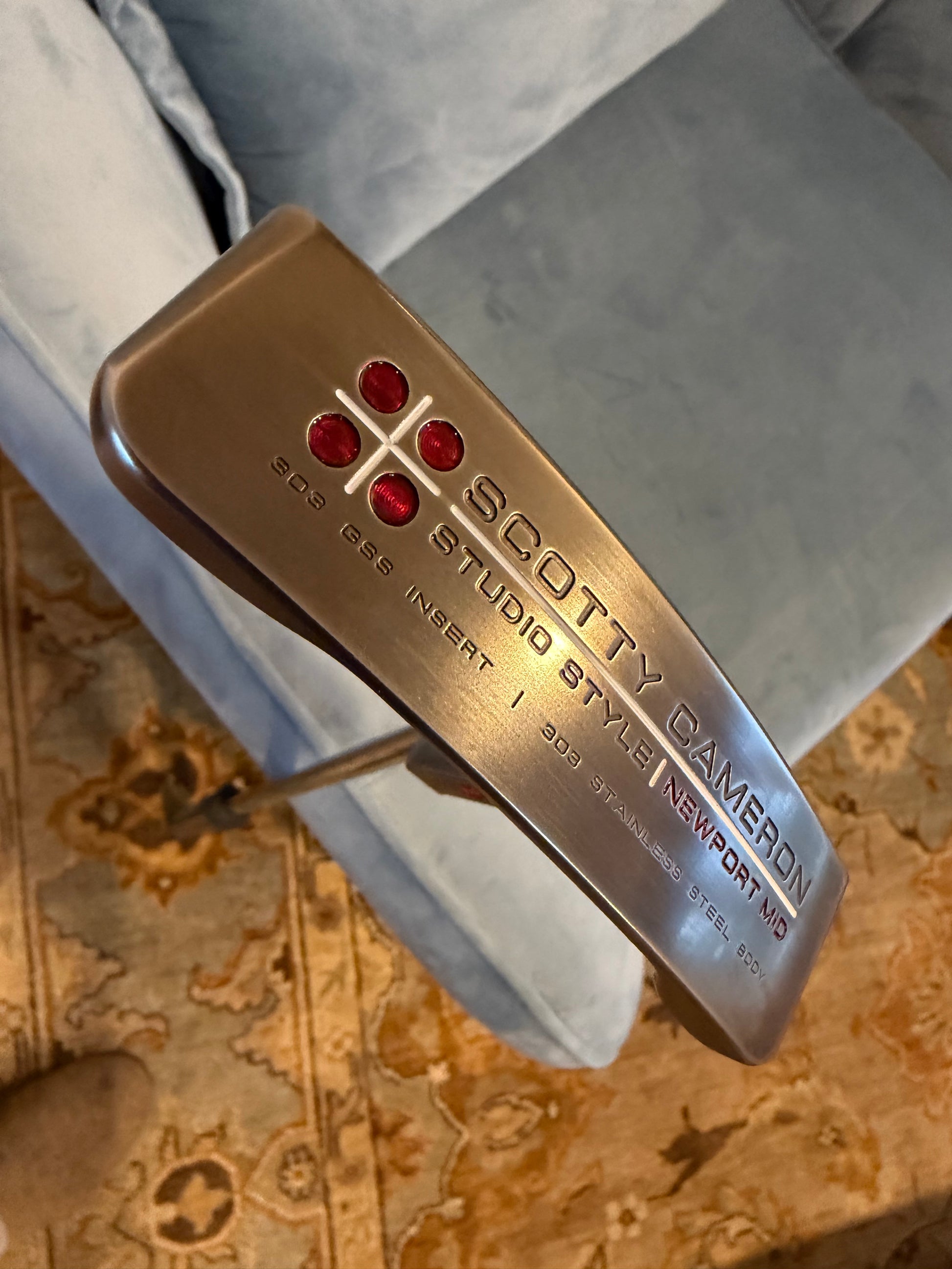 A Bigger, heavier studio style Newport. Originally on a 43” shaft with a split grip. These work even better as a counterbalance. Awesome. Putter is finished in my “gun blue” - in this case just an acidic stainless treatment that will age with you! Candy red paint. Face insert is 303GSS and original, putter is in nearly perfect condition.