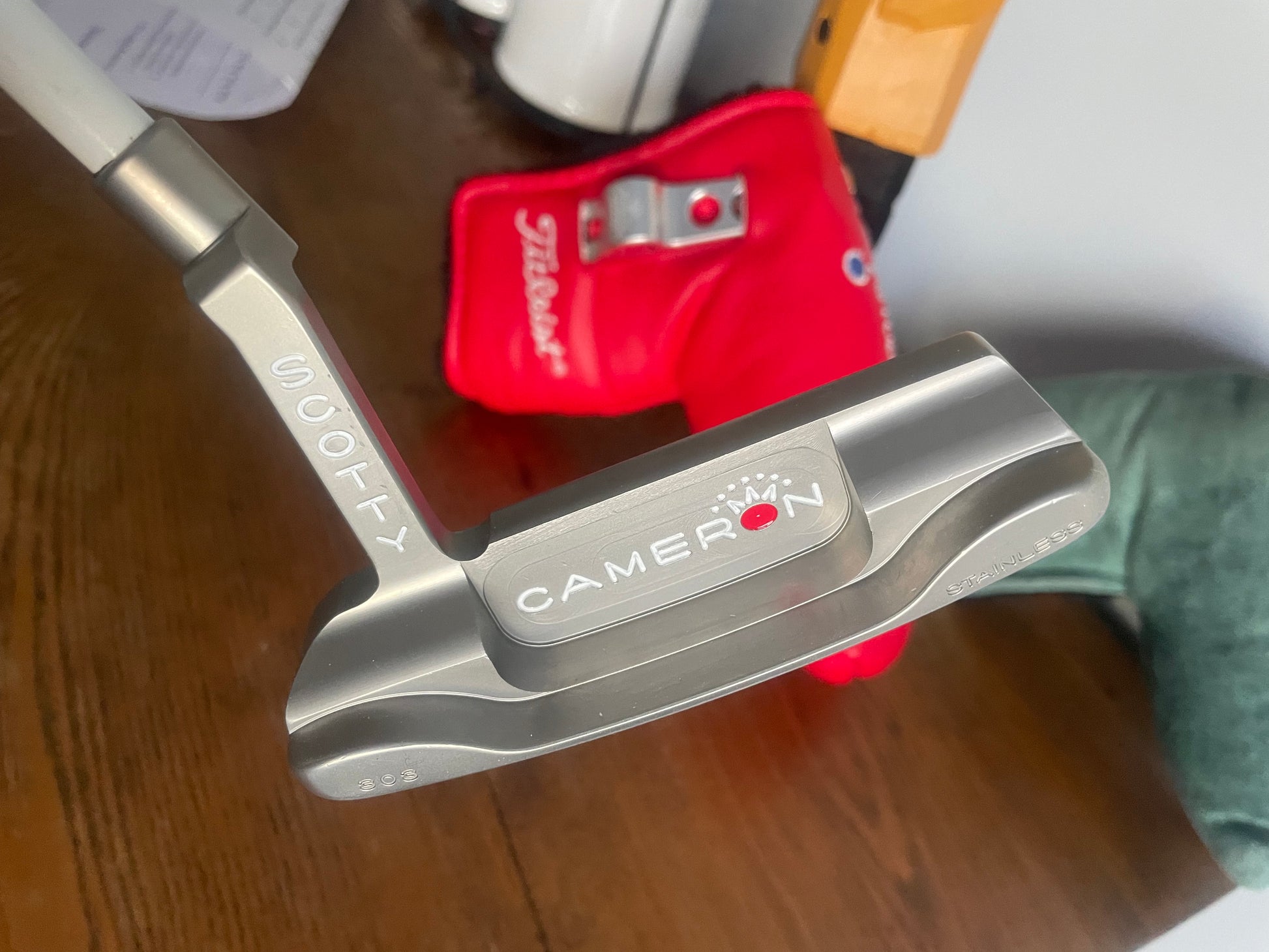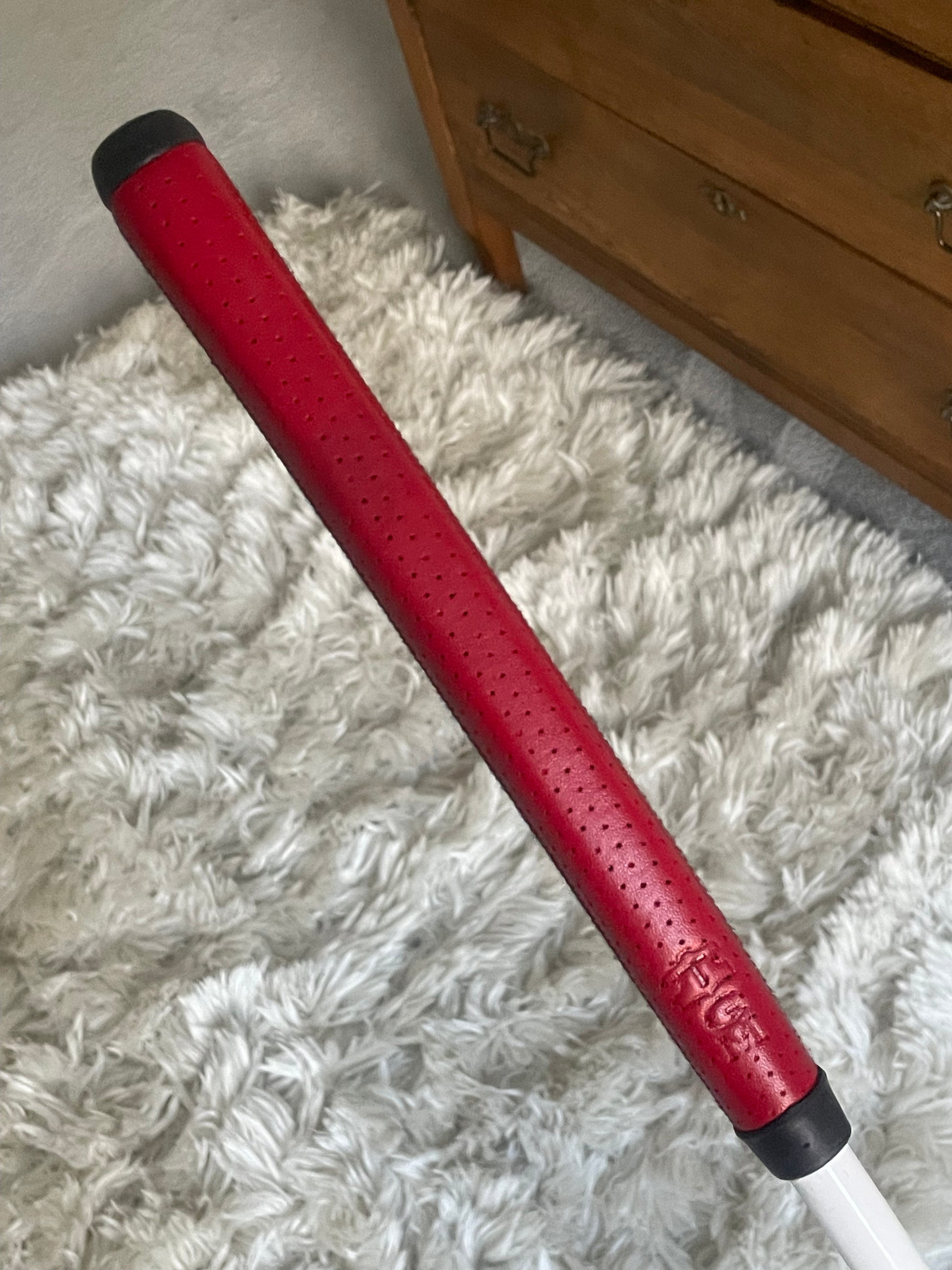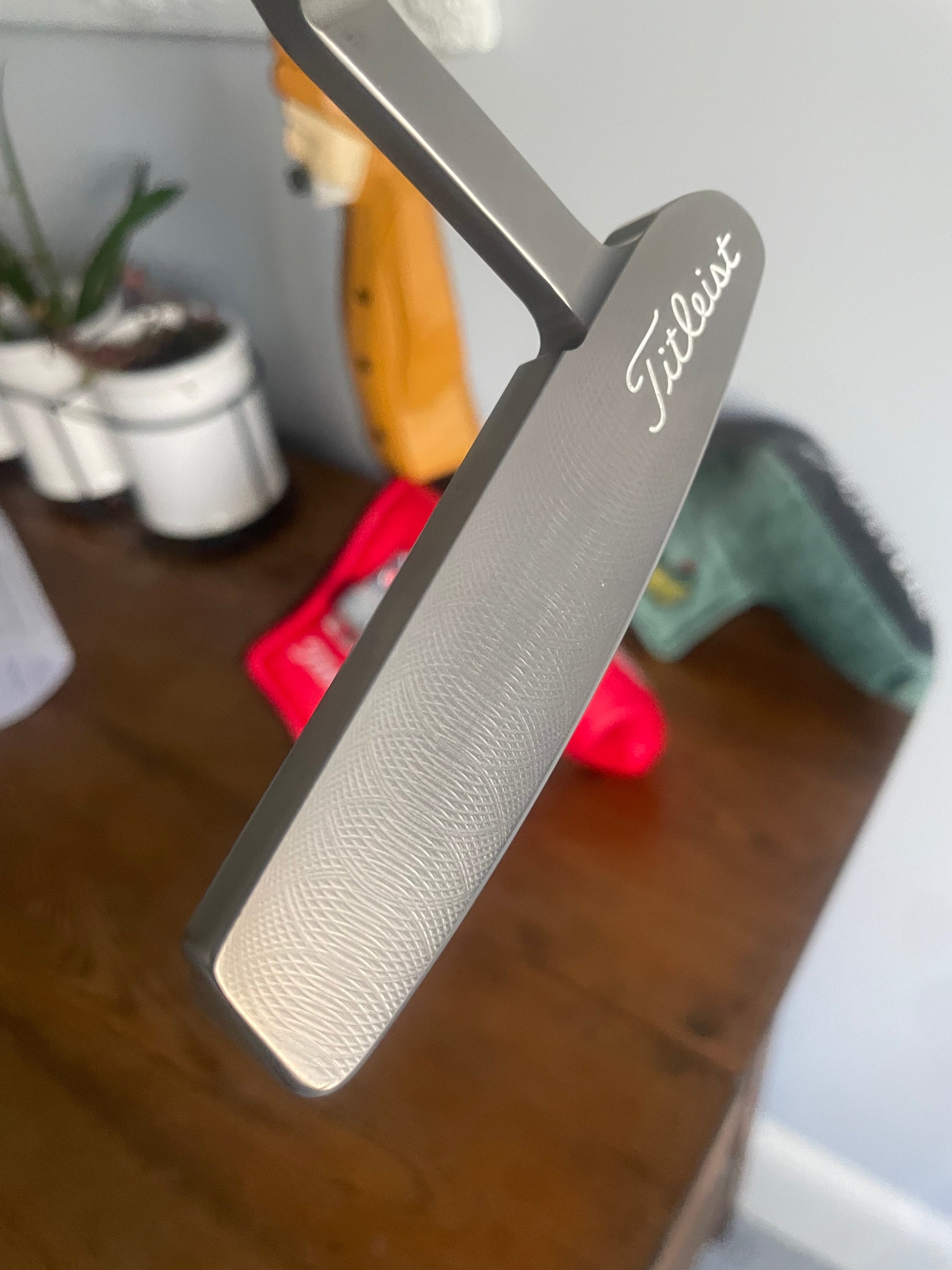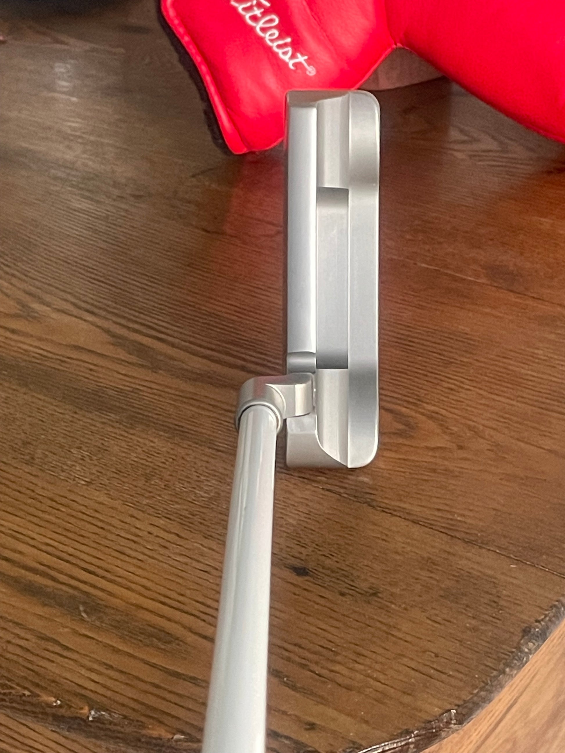 This one plays 35 or just a hair under. New gloss white KBS GPS 120. Putter is in stunning original condition. I did brighten up the paint in a few places. But milling is 100% original, this putter may never have rolled a ball. Beautiful piece for a collector or a player, or both!