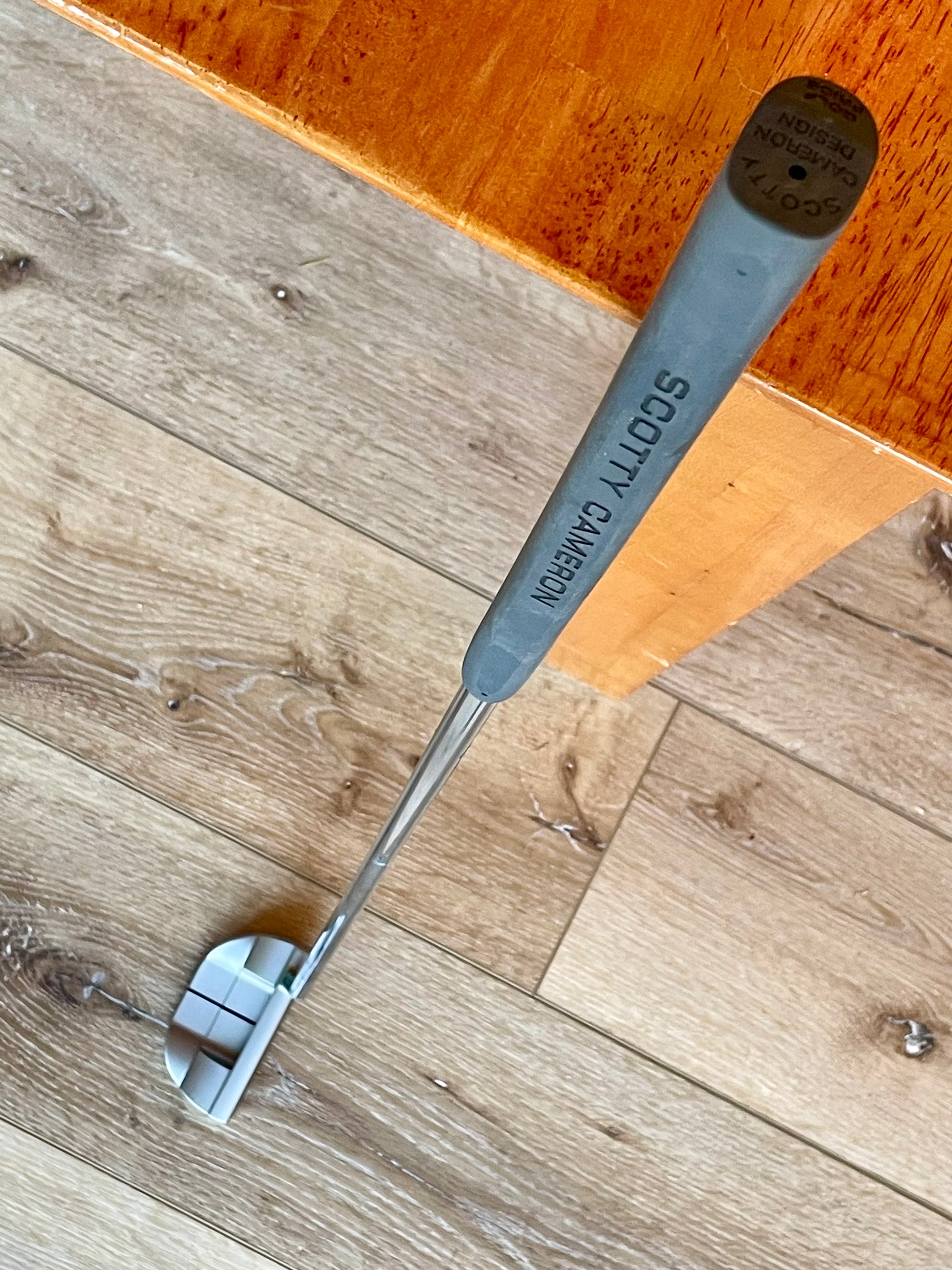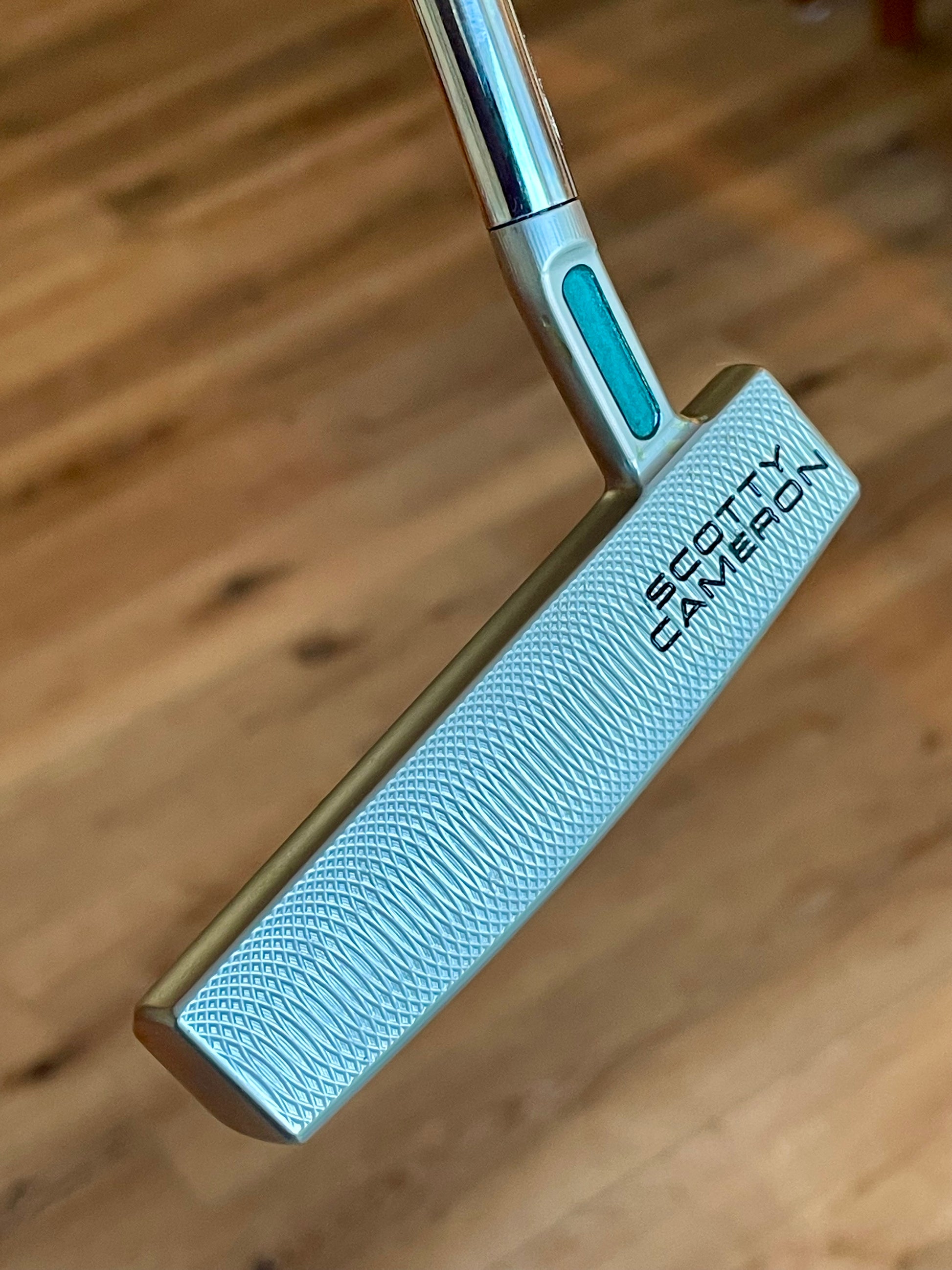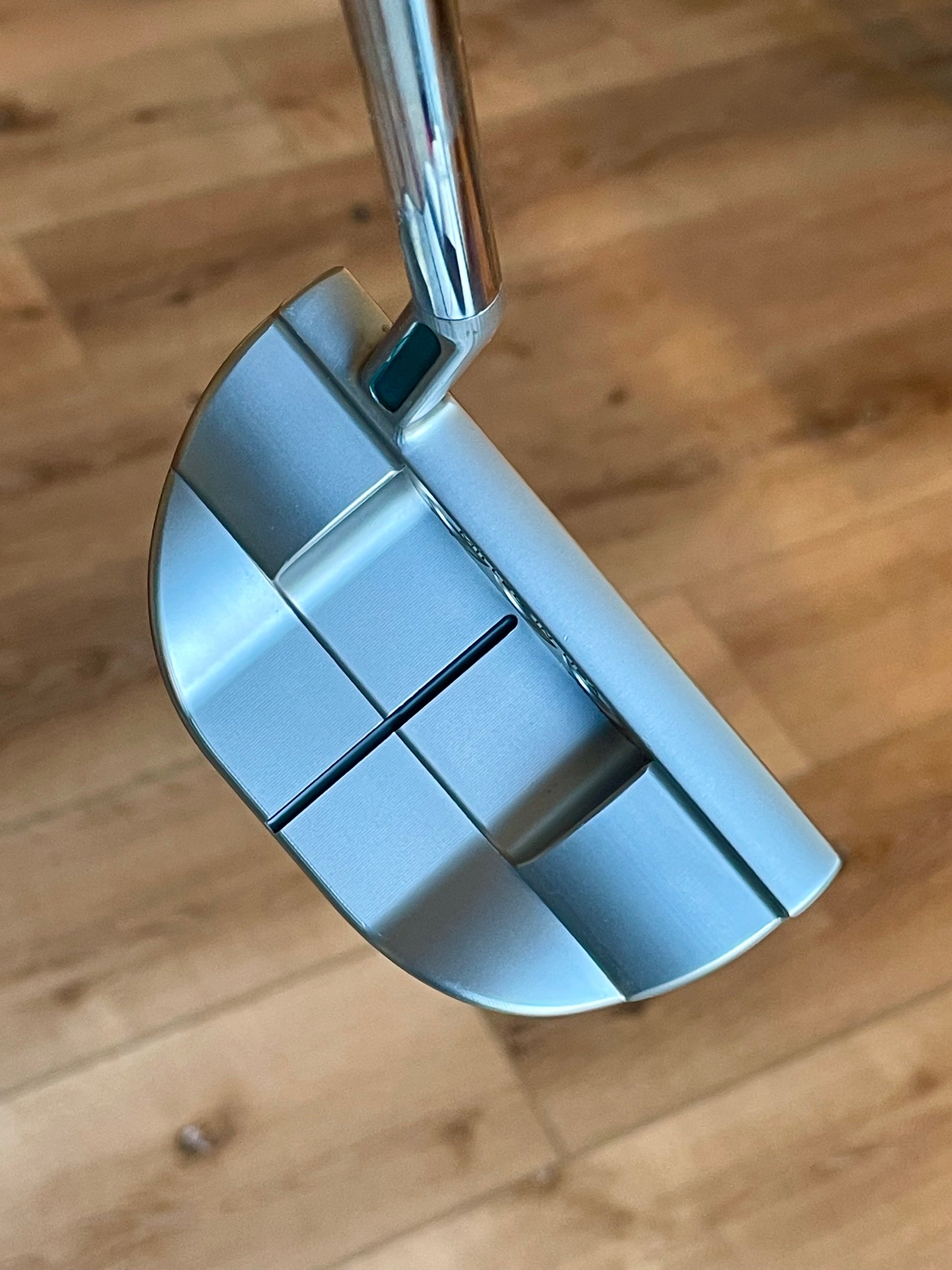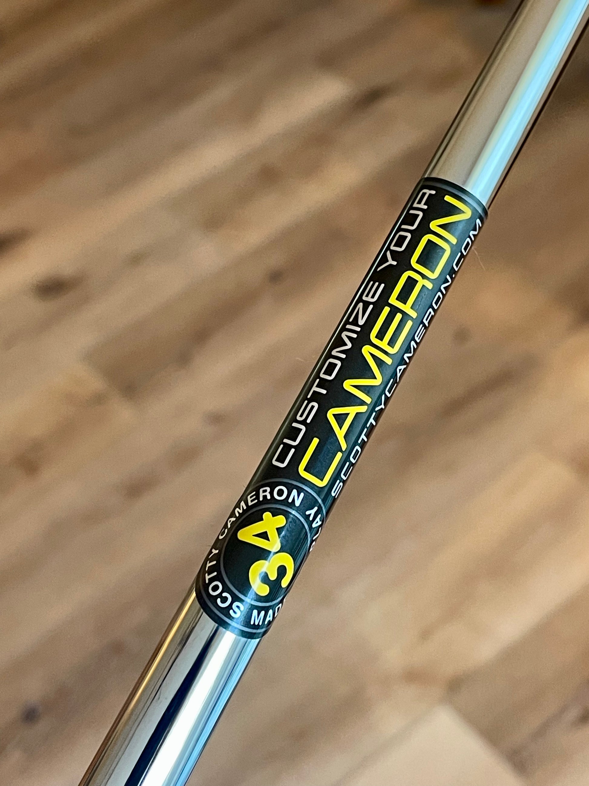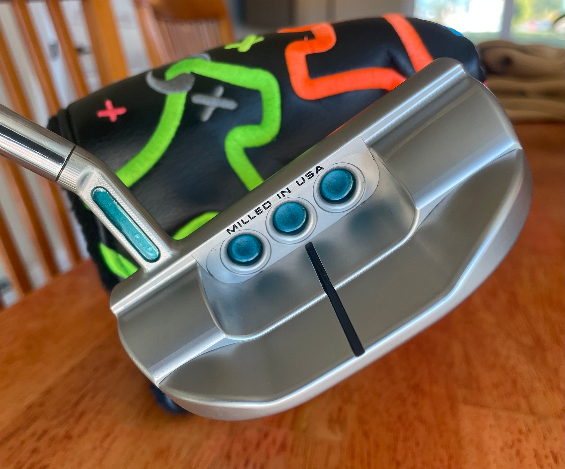 This one is 34" - rebuilt on a new Phantom shaft with the grey pistolero plus. Matches this cover perfectly! Cover went outside once or twice. No loose threads- excellent condition. Putter is new. Baseplate is coated turquoise to match neck/back dot paint. Tour satin finish.
