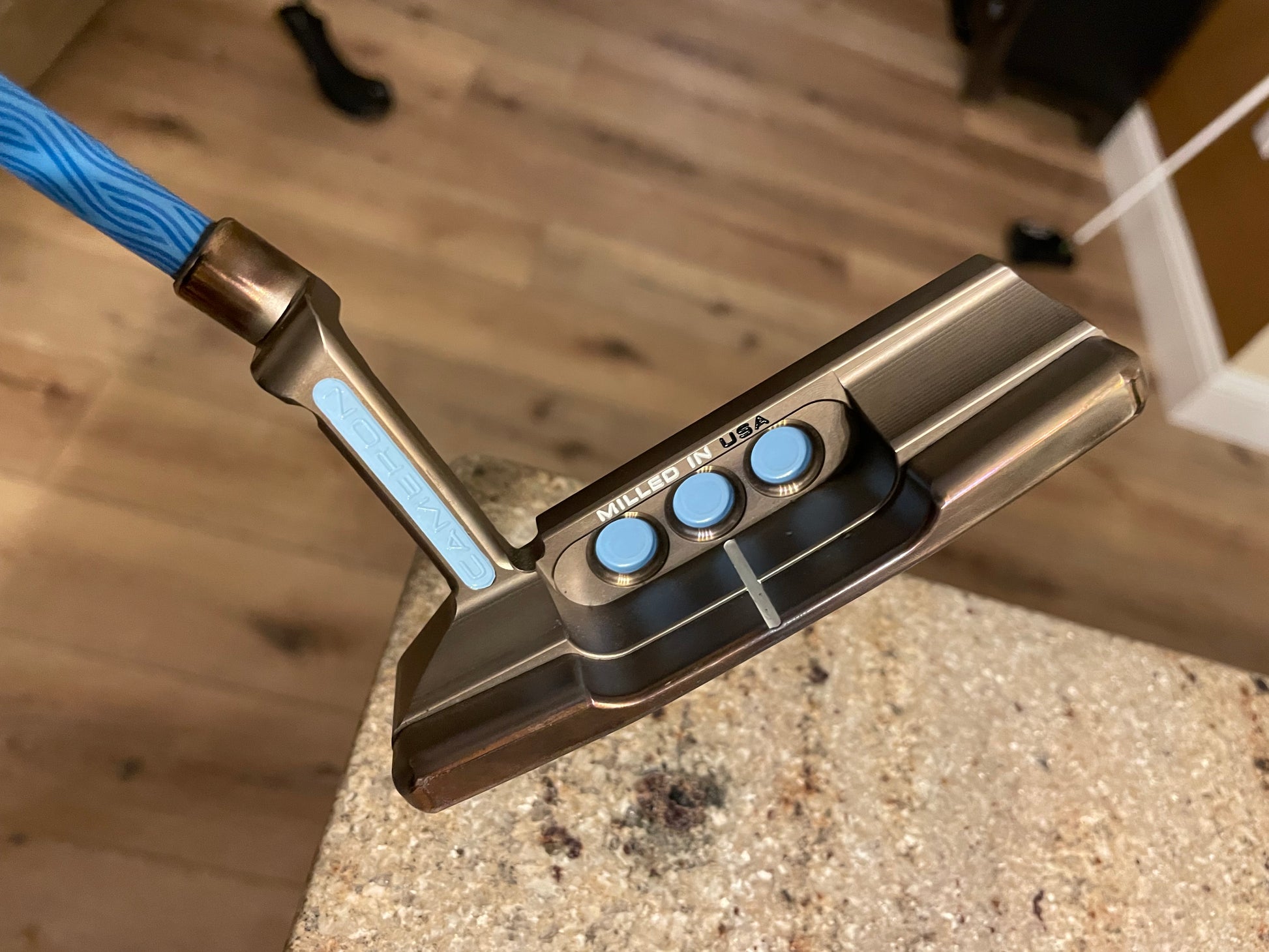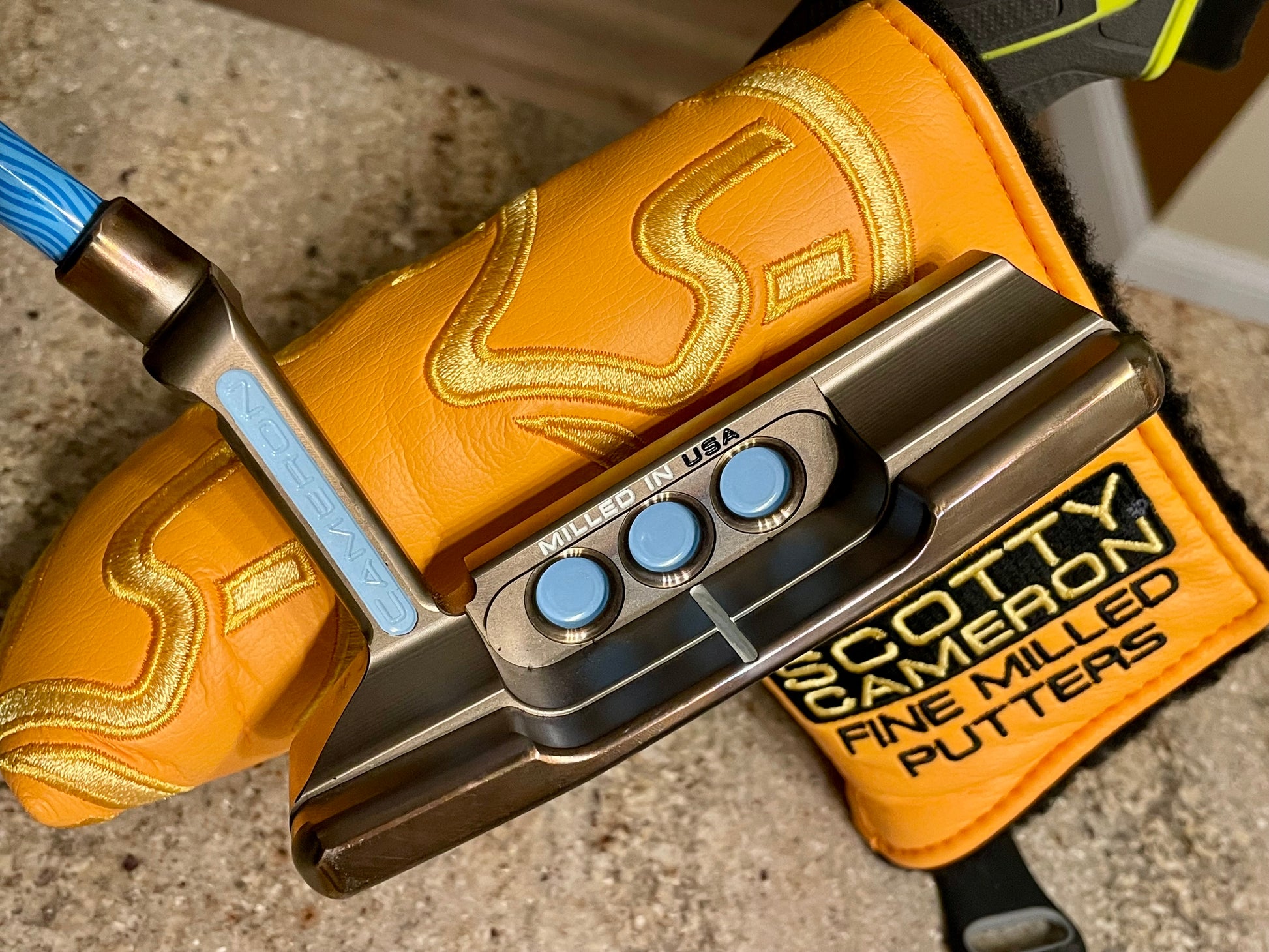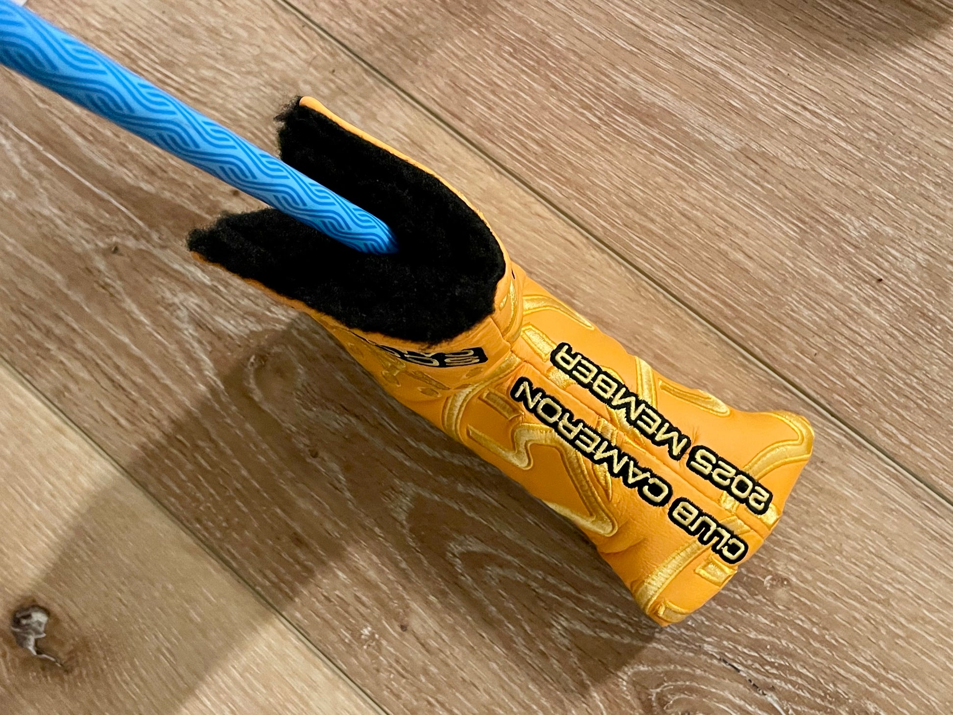 Black cabretta leather paddle grip from the Gripmaster, on a limited release "blue wave" KBS GPS 120 graphite shaft. These setups feel unbelievable. Included is a 2025 Cameron Club headcover to match, while supplies last! Putter is in new condition. Plays 35 inches.