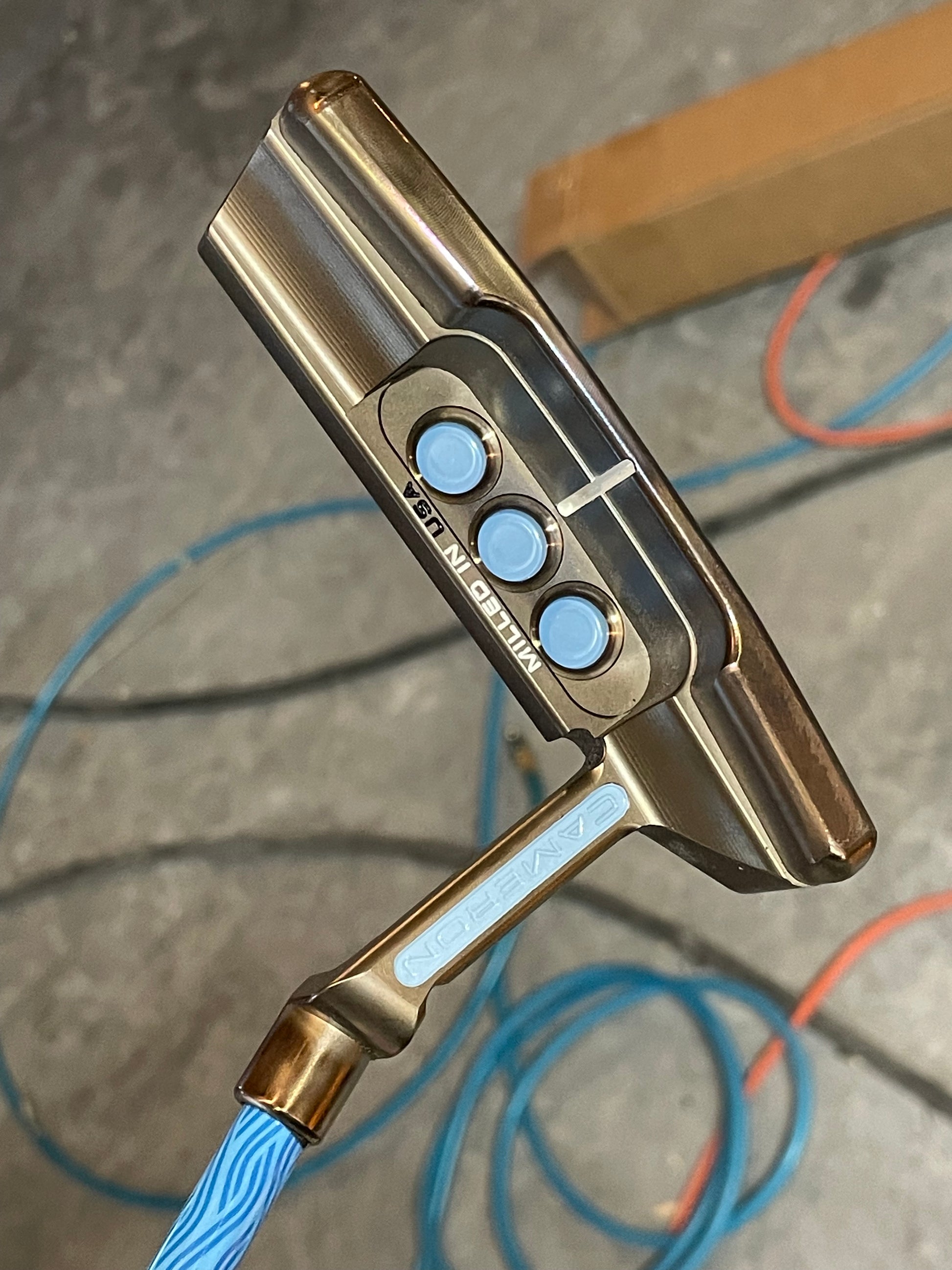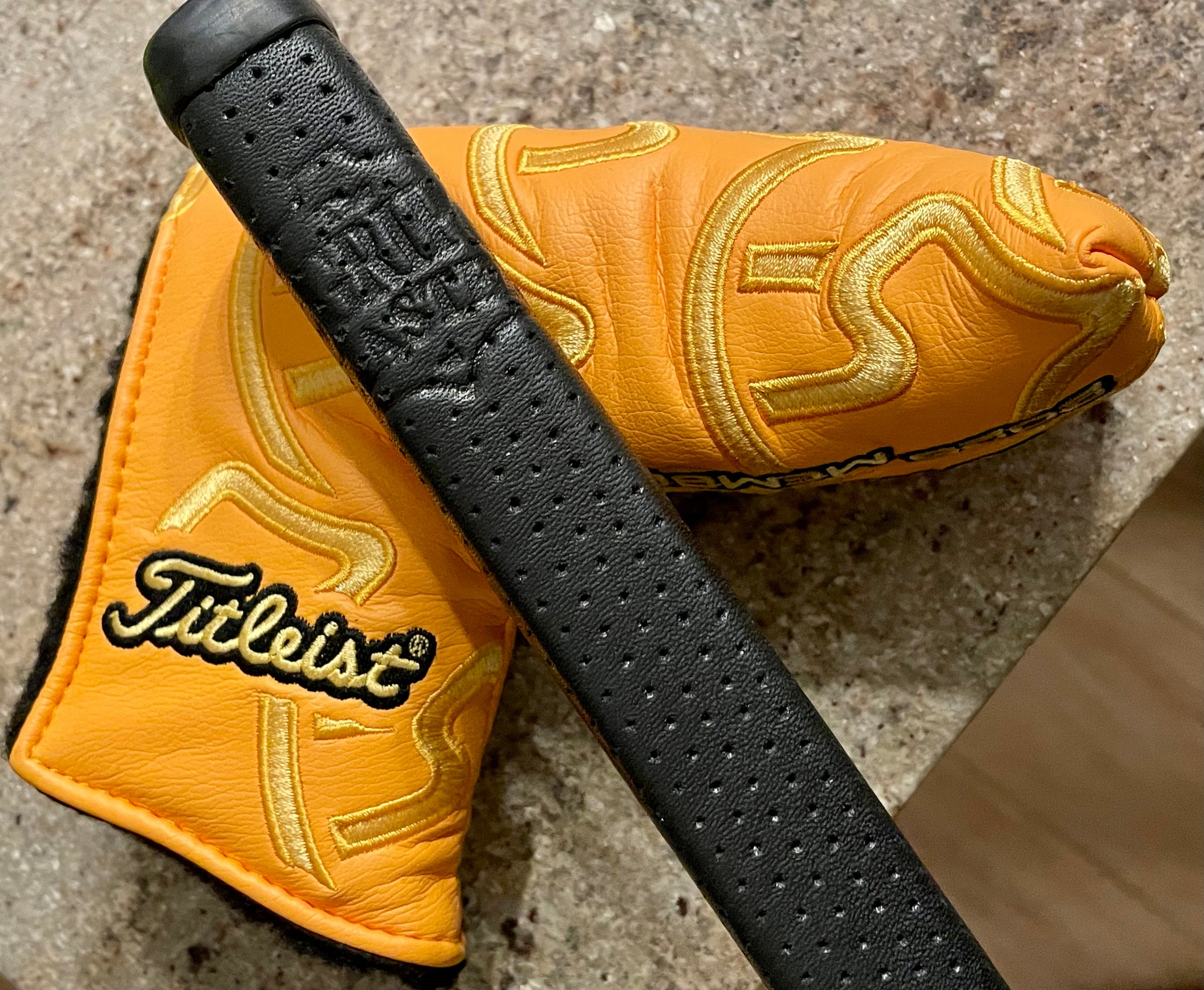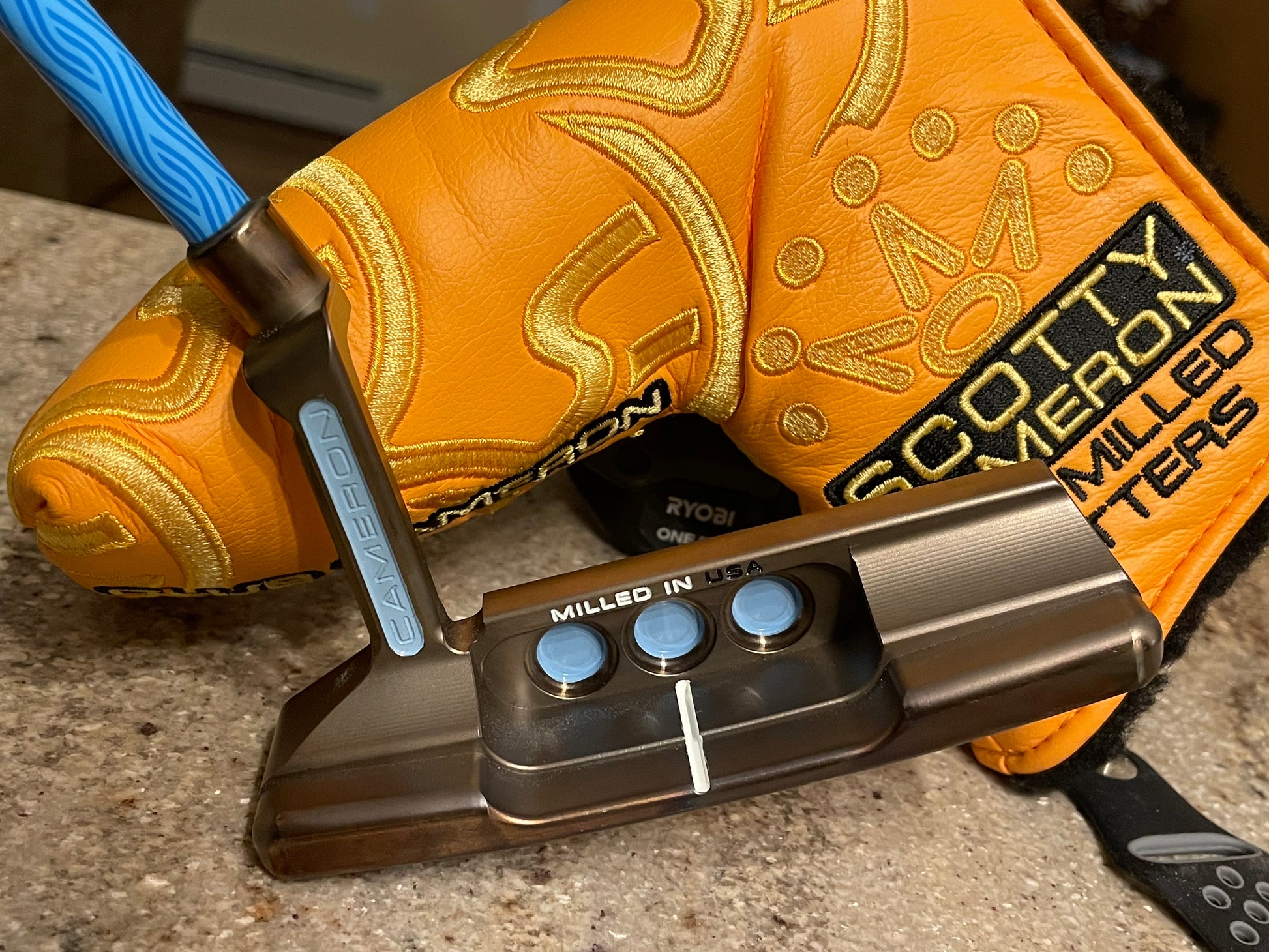 Black cabretta leather paddle grip from the Gripmaster, on a limited release "blue wave" KBS GPS 120 graphite shaft. These setups feel unbelievable. Included is a 2025 Cameron Club headcover to match, while supplies last! Putter is in new condition. Plays 35 inches.