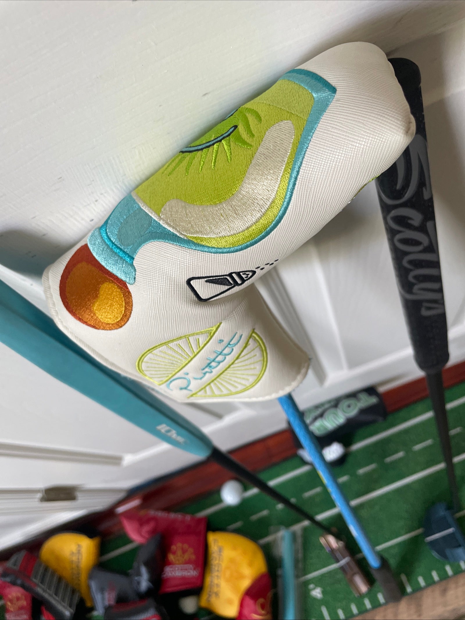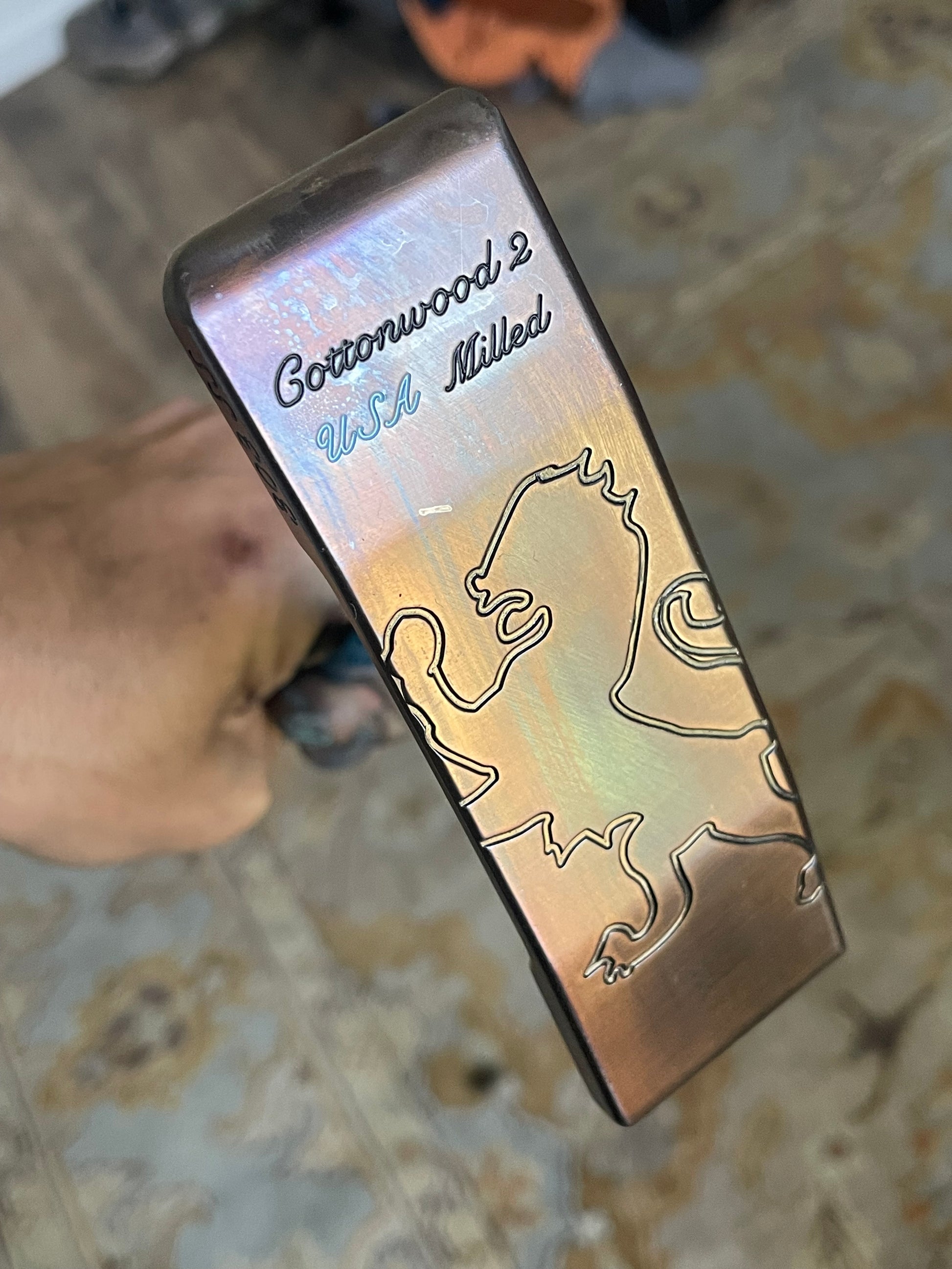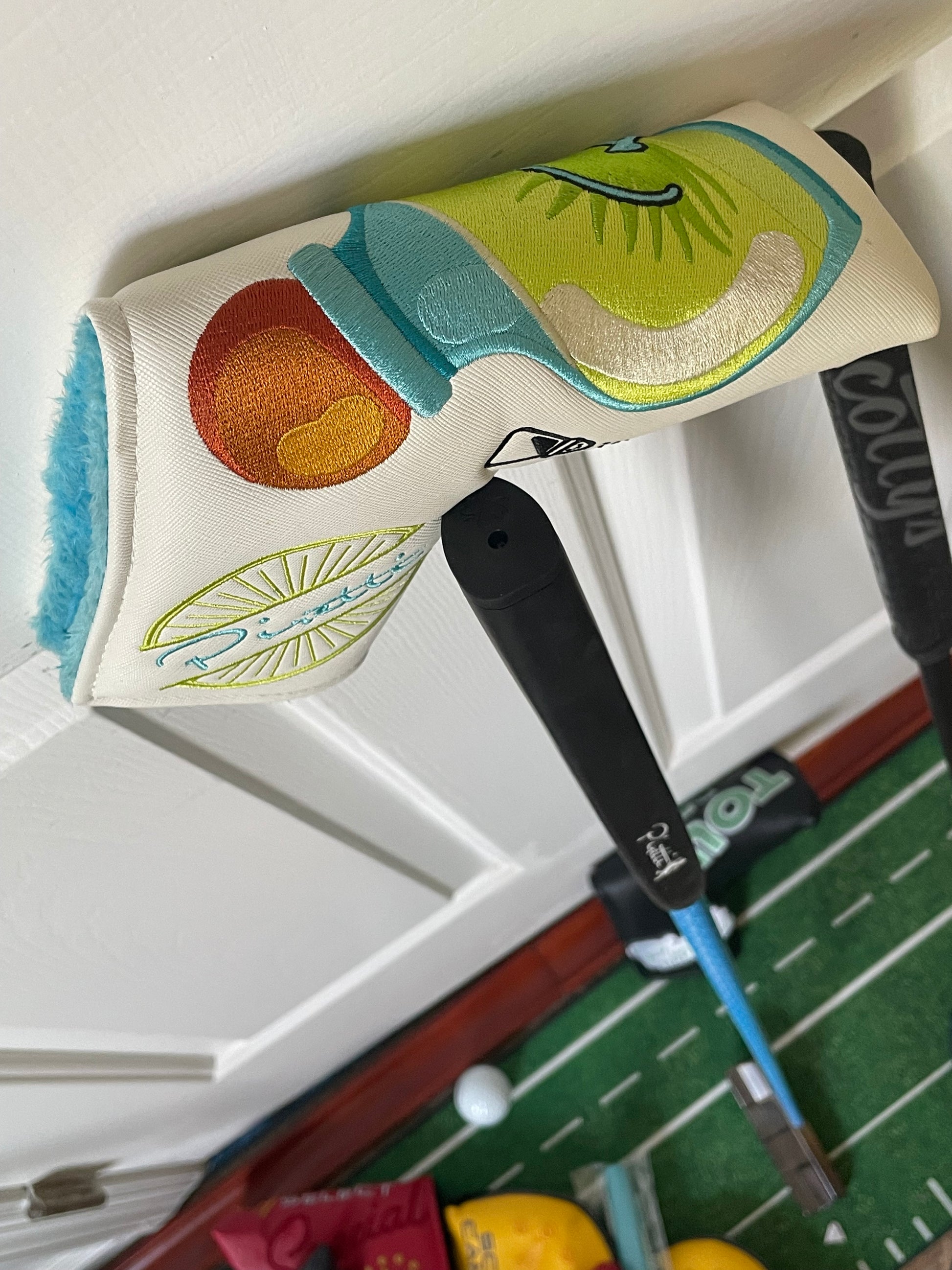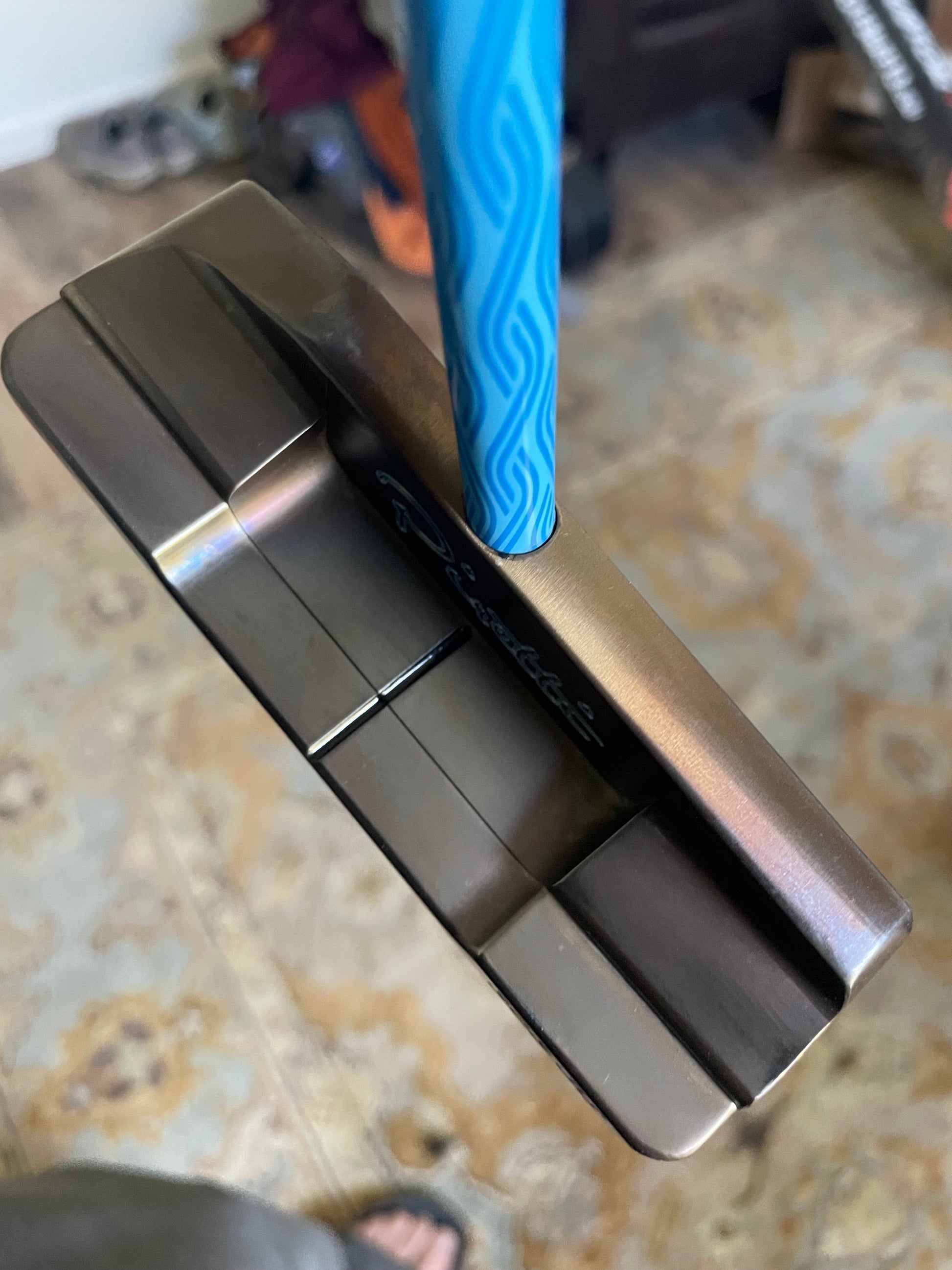 This is a sweet center shaft... much bulkier than the Scotty Newport 2.6, and a heavier head weight as well for more stability during the stroke. Torched twice, oil quenched, and painted metallic black/UNC blue. Included is a new "Tour Only" Piretti headcover with magnetic closure and a high quality plush lining. Best covers in the game! Plays just over 34" - happy to adjust!