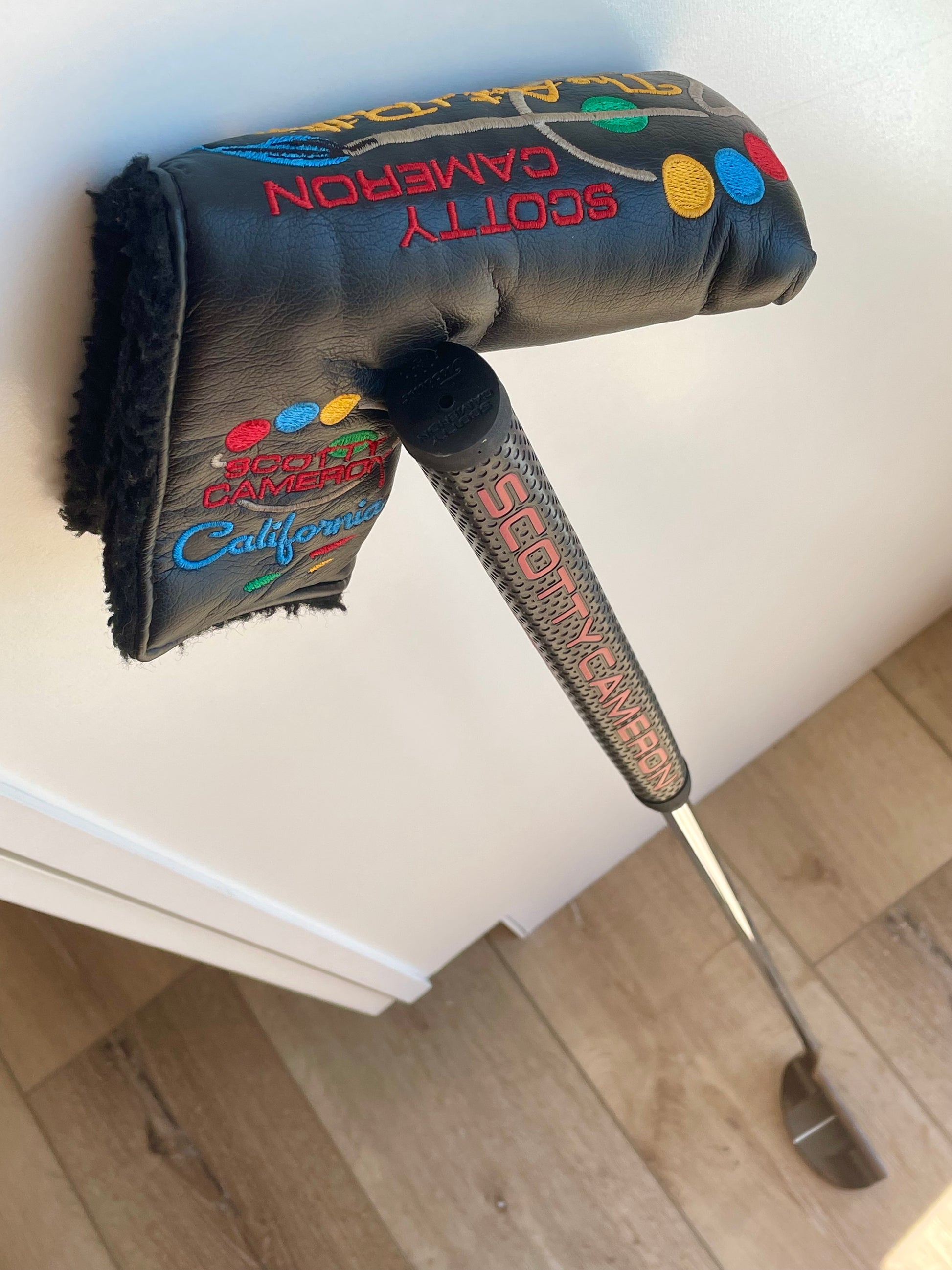 Restored, the face left alone, torched and oil quenched, then painted back to original! This putter plays 34.5" - is weighted beautifully and correctly - and includes a brand new custom shop midsize matador grip, and it's original headcover in beautiful shape! This is one of my favorite Scotty headcover designs ever, and they're becoming harder and harder to find. This one is in exceptional condition.