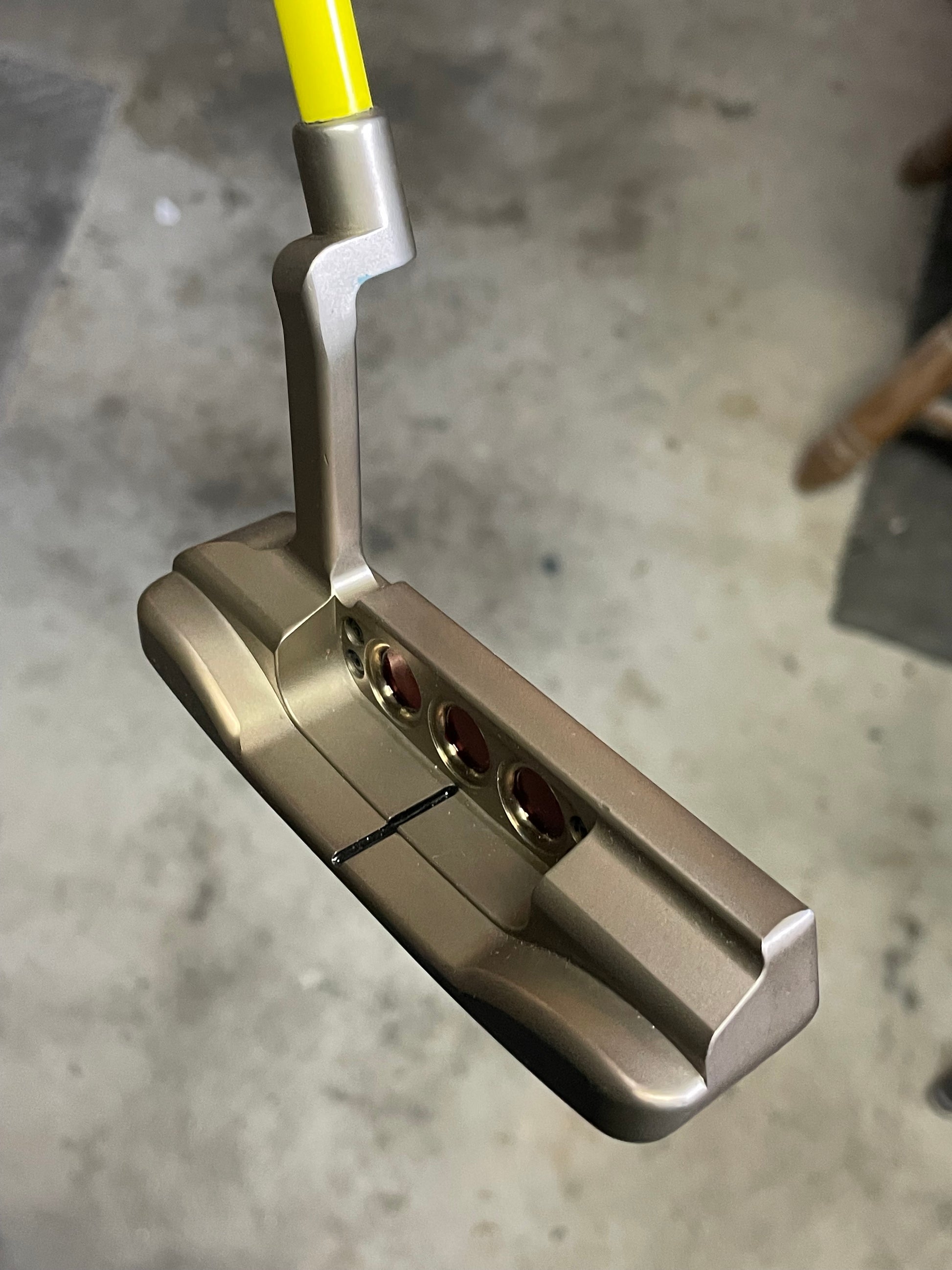 Body was given a tour satin finish and torched, for a soft, uniform glowing bronze. Subtle at a distance, but a killer custom putter up close. Classy!