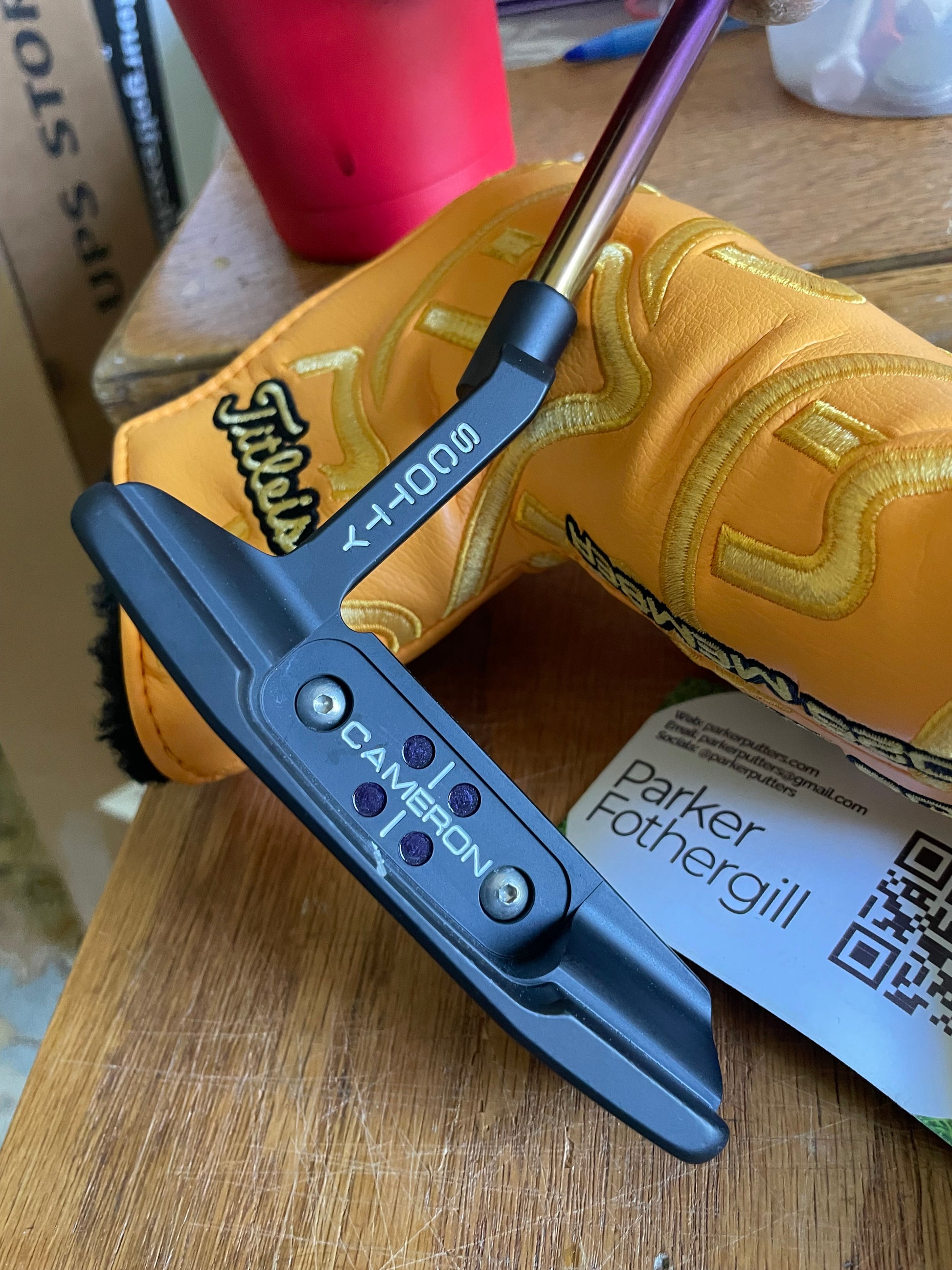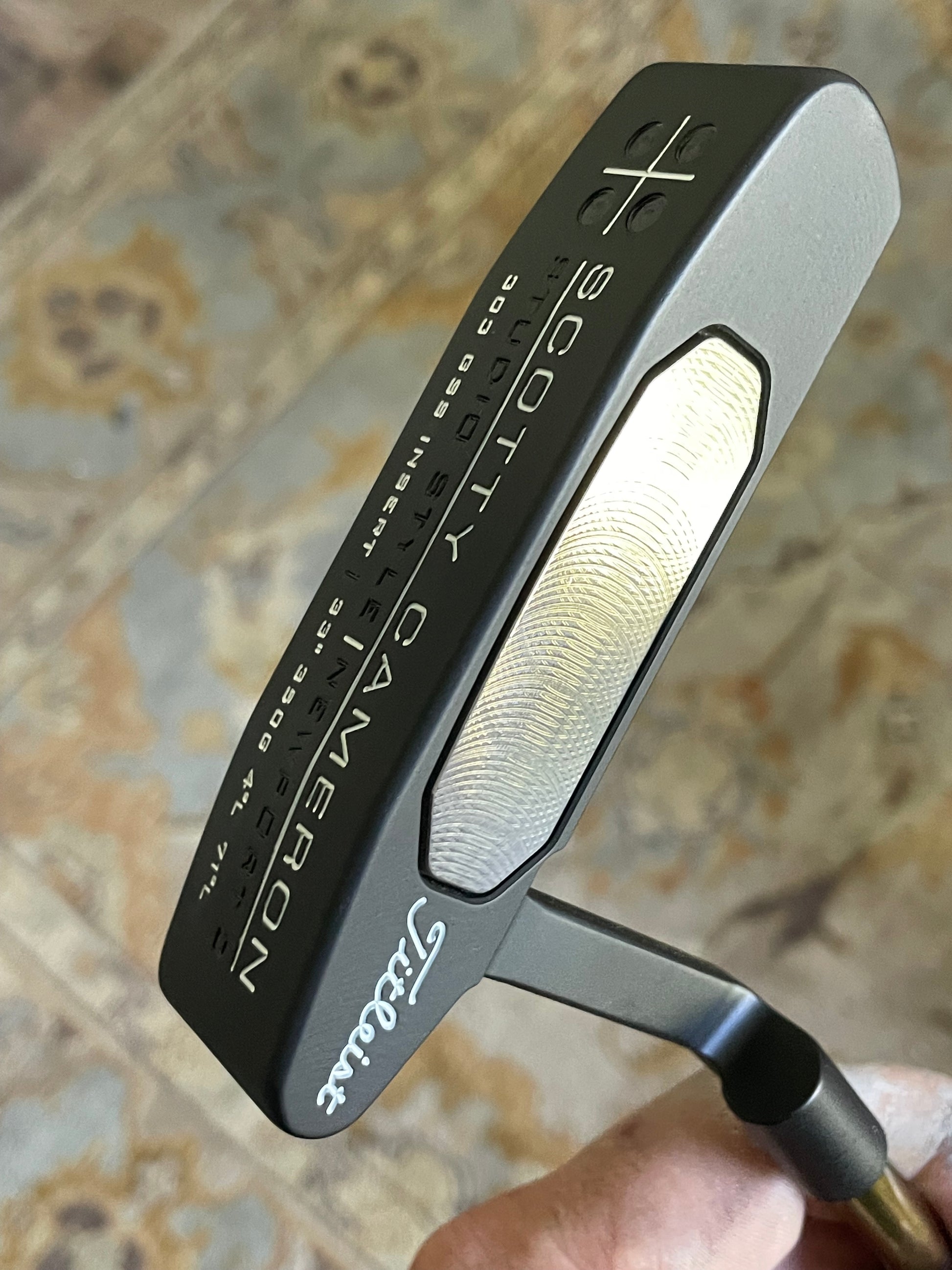 On a new KBS GPS 120 shaft in rainbow PVD, with a "Full Contact" grip, this is an awesome build. The face insert is in mint original condition- polished for some shine- and this head was not in need of any cleanup, meaning the weight is all there. Most custom places fail to prioritize weight... by rushing, using heavy machinery (wasteful). etc. This putter weighs 350g. This is a really great example of what I do. Headcover options available.. I would include a 2024 Cameron Club cover, or a 2025 studio style, or 2025 Cameron Club pictured- I have all while supplies last.