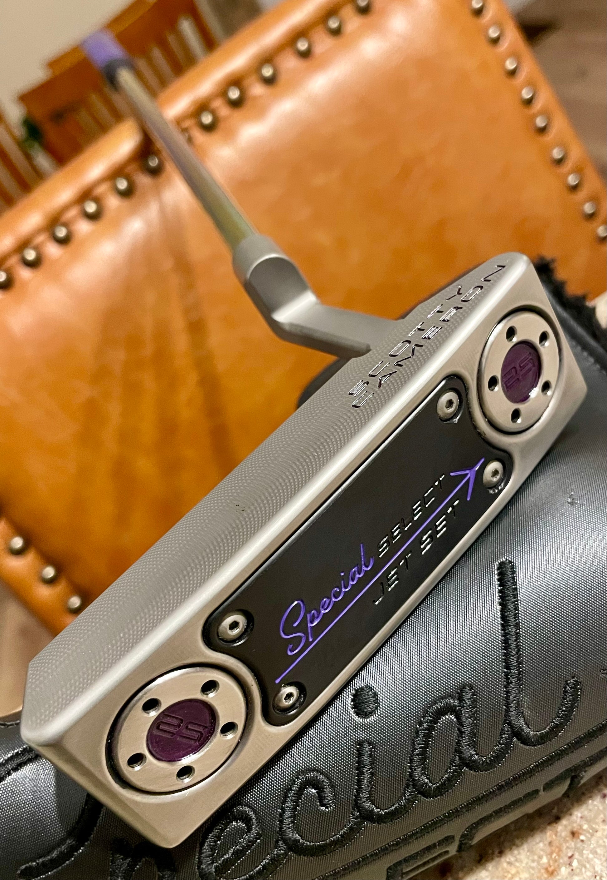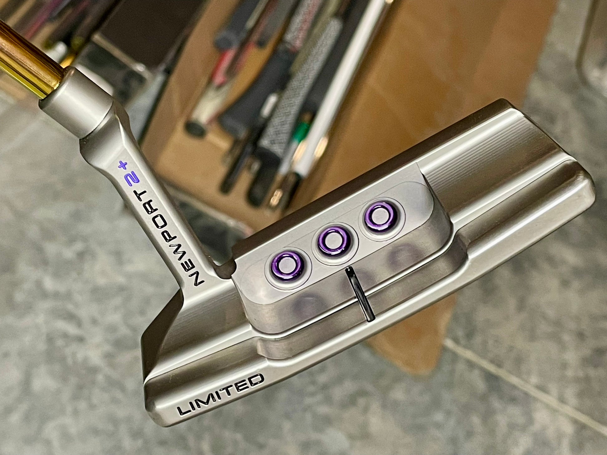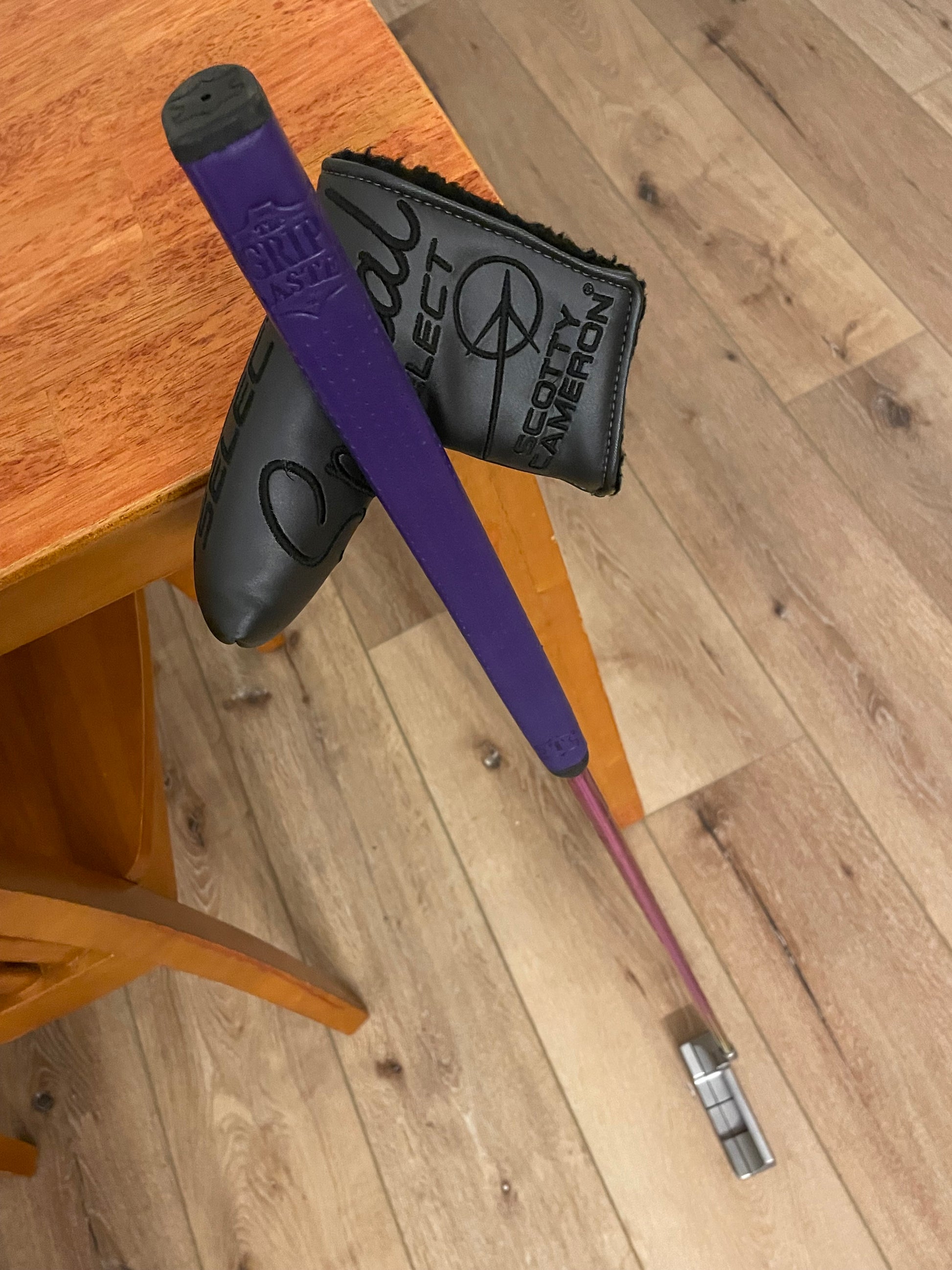 Leather long grip from the Gripmaster- these are so soft. Rainbow micro-stepped shaft from KBS- not available to the public - with a little tie dye shaft sticker! Includes stock cover, lightly used. Putter came in black PVD, which was not very durable... So I scored this one and brought it to satin (raw stainless). Gloss grape and purple fills. You certainly won't see one like this. Playing length is roughly 34" - maybe 34.5" - it depends where you choose to hold this grip.