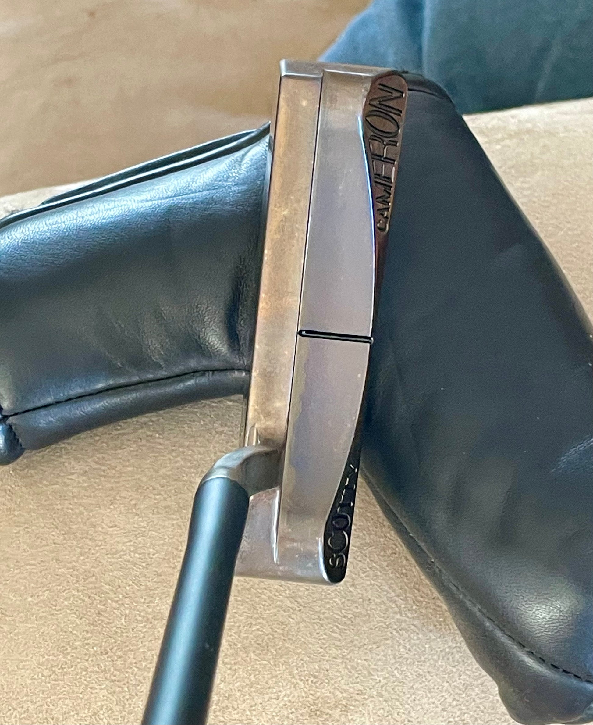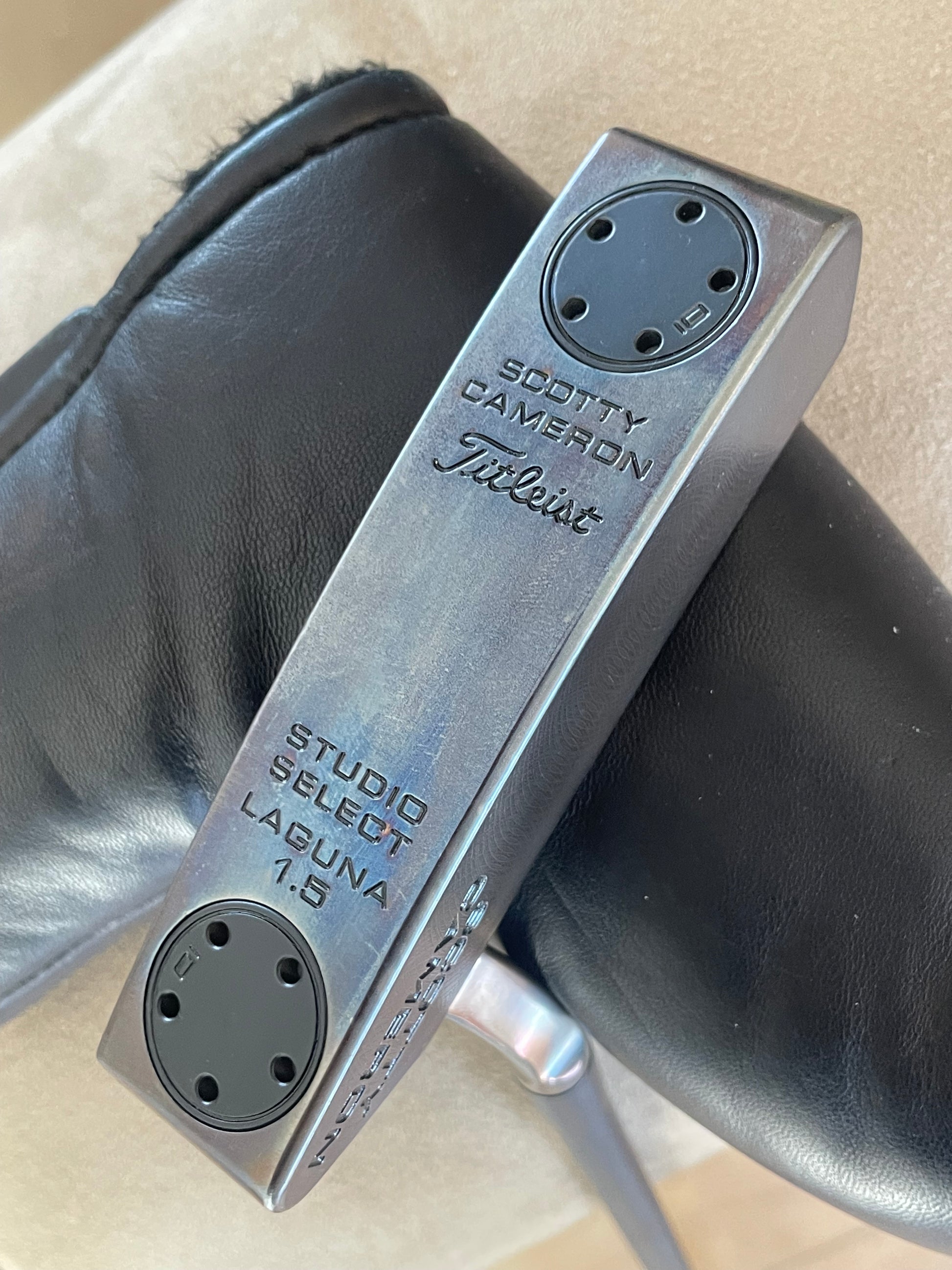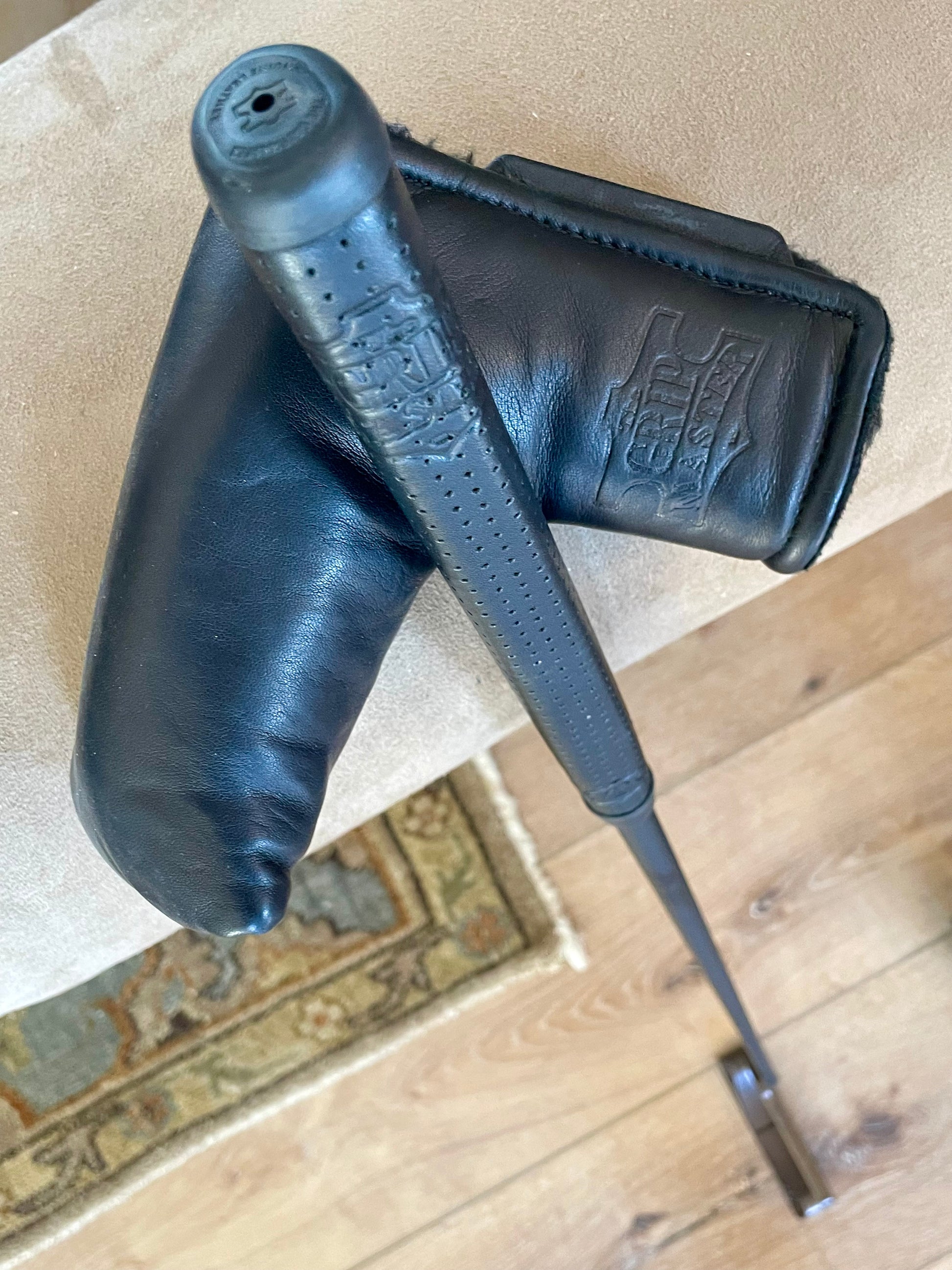 This is a sweet one. Laguna 1.5, with the awesome back lettering they only did once. And a flow neck. Two great things! What else? Mint original milling. I'm always looking for these. They're harder to find like this one all the time. New black shaft, and a midsize cabretta leather grip from the Gripmaster. This cover is hard to get! Blacked out embossed leather magnetic cover that matches the grip down to the stitching. I'm a big fan of the Gripmaster. Whoever buys this putter will be too. These really protect oil can finishes better than Scotty's abrasive velcro. Plays 35"