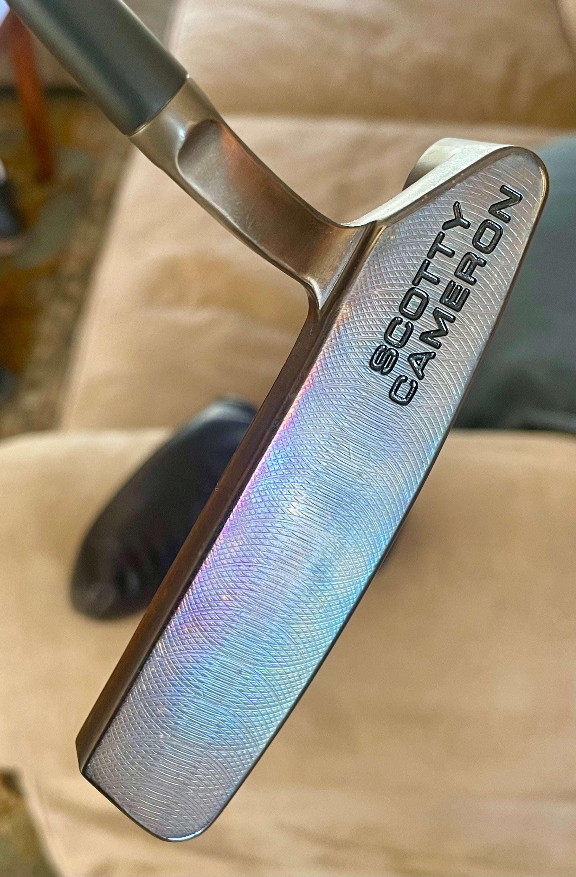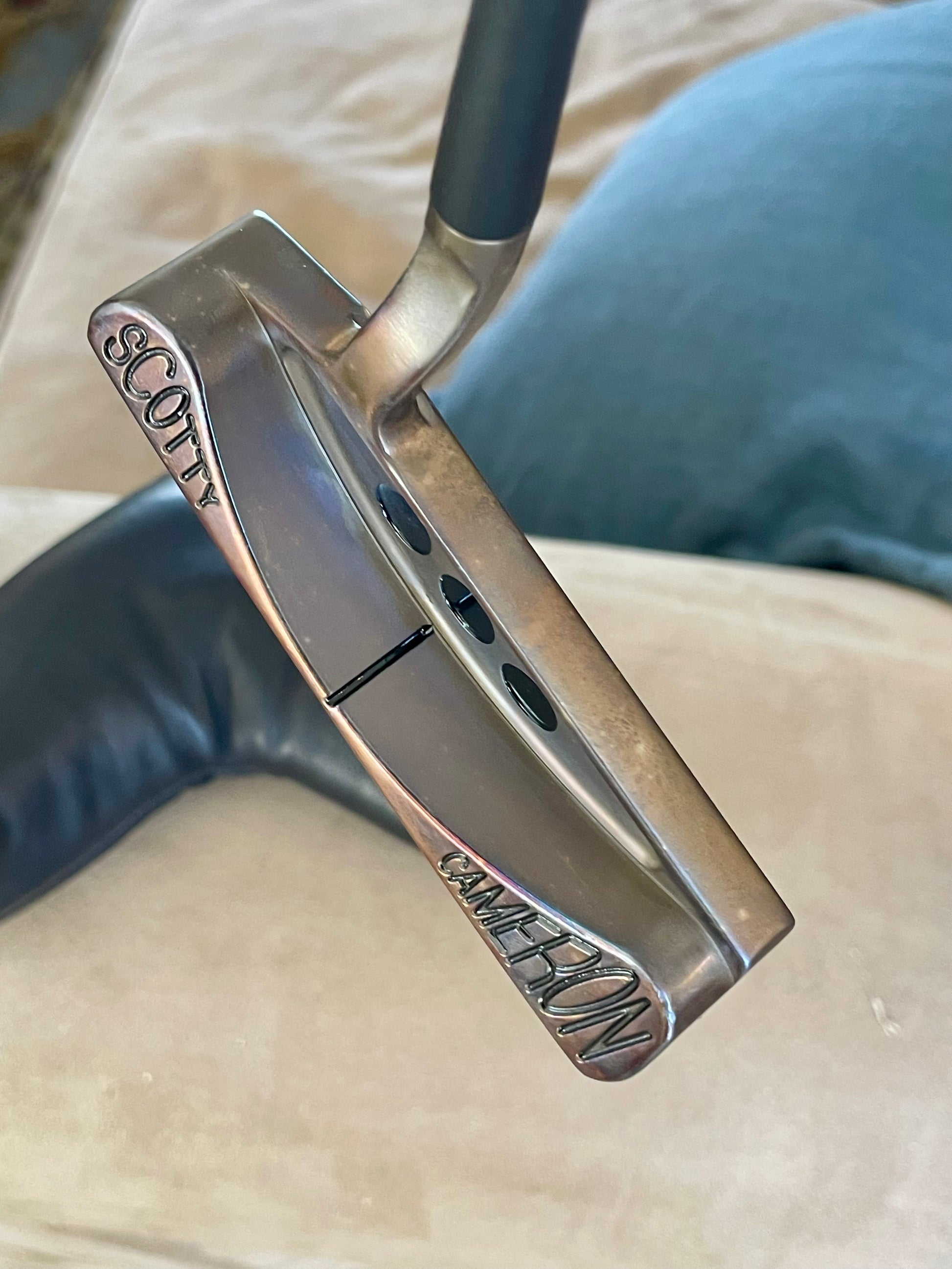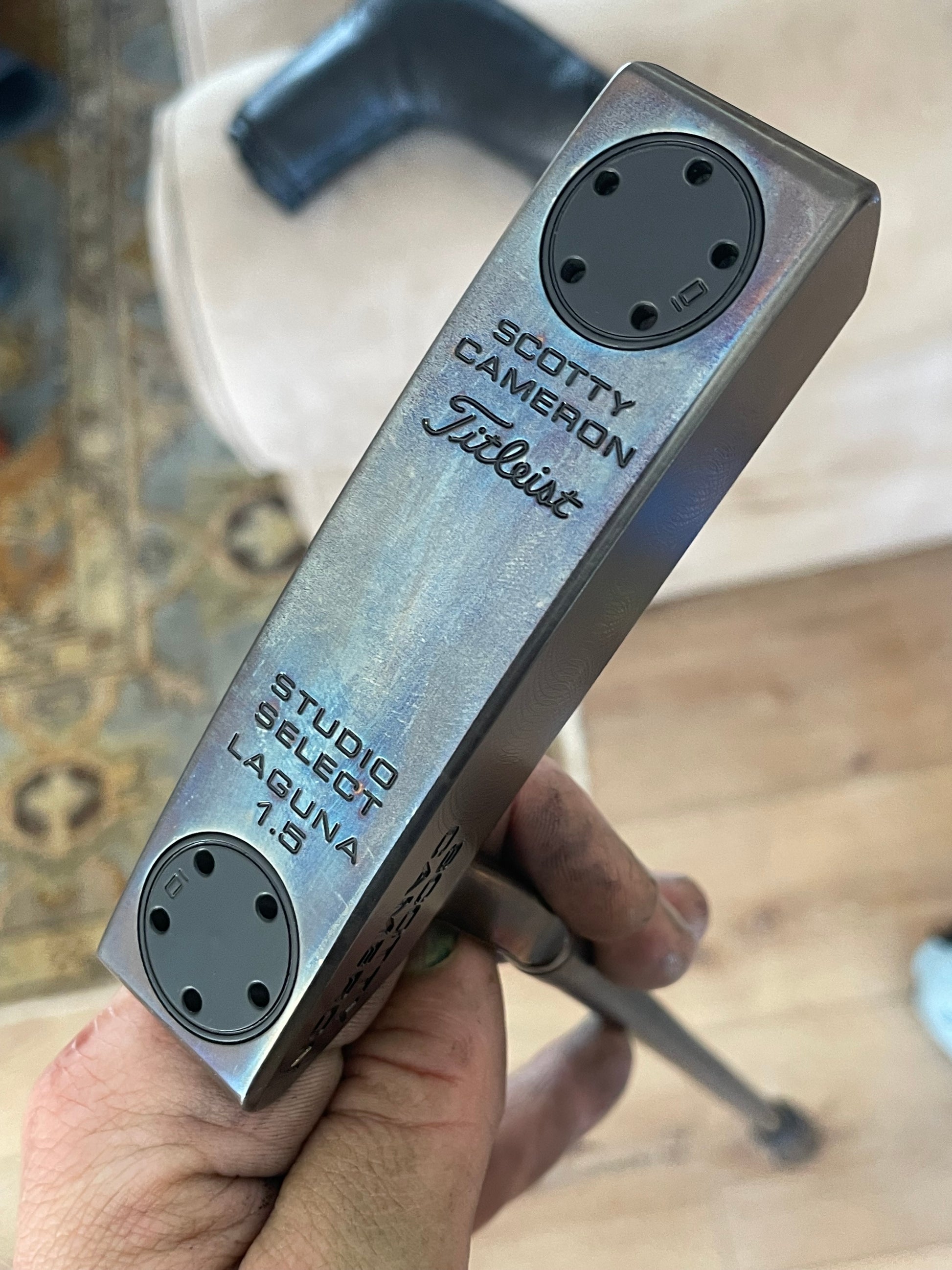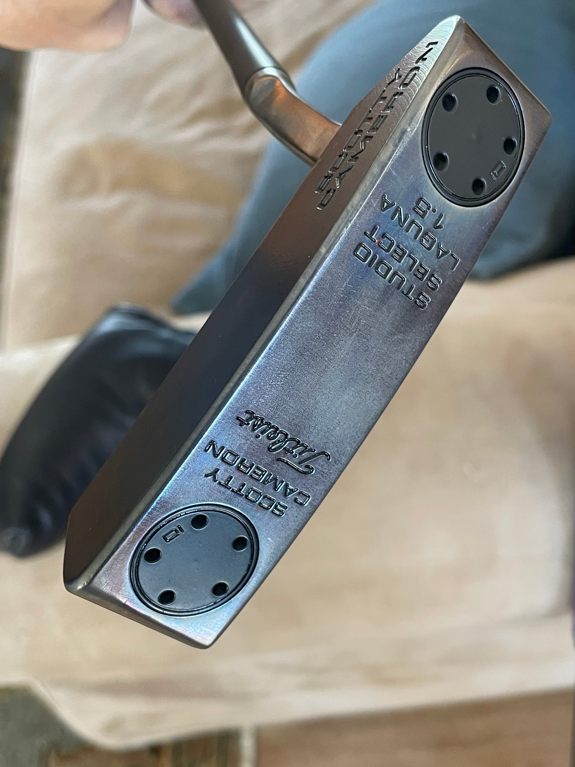 This is a sweet one. Laguna 1.5, with the awesome back lettering they only did once. And a flow neck. Two great things! What else? Mint original milling. I'm always looking for these. They're harder to find like this one all the time. New black shaft, and a midsize cabretta leather grip from the Gripmaster. This cover is hard to get! Blacked out embossed leather magnetic cover that matches the grip down to the stitching. I'm a big fan of the Gripmaster. Whoever buys this putter will be too. These really protect oil can finishes better than Scotty's abrasive velcro. Plays 35"