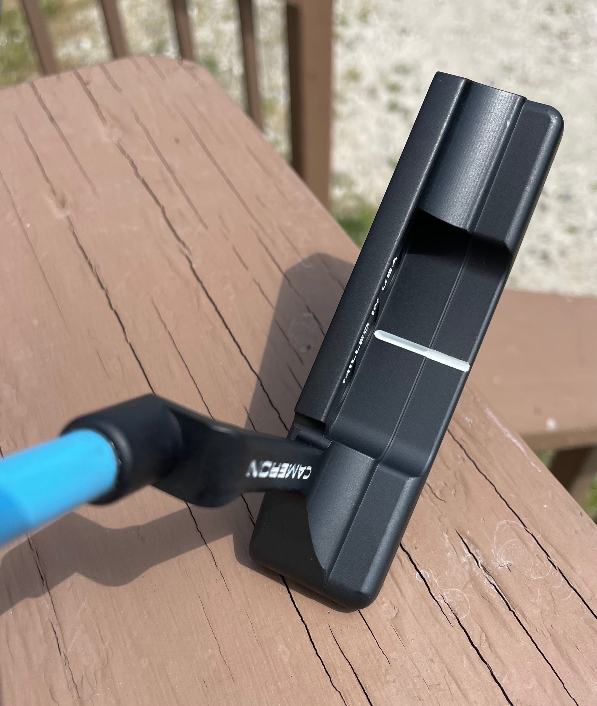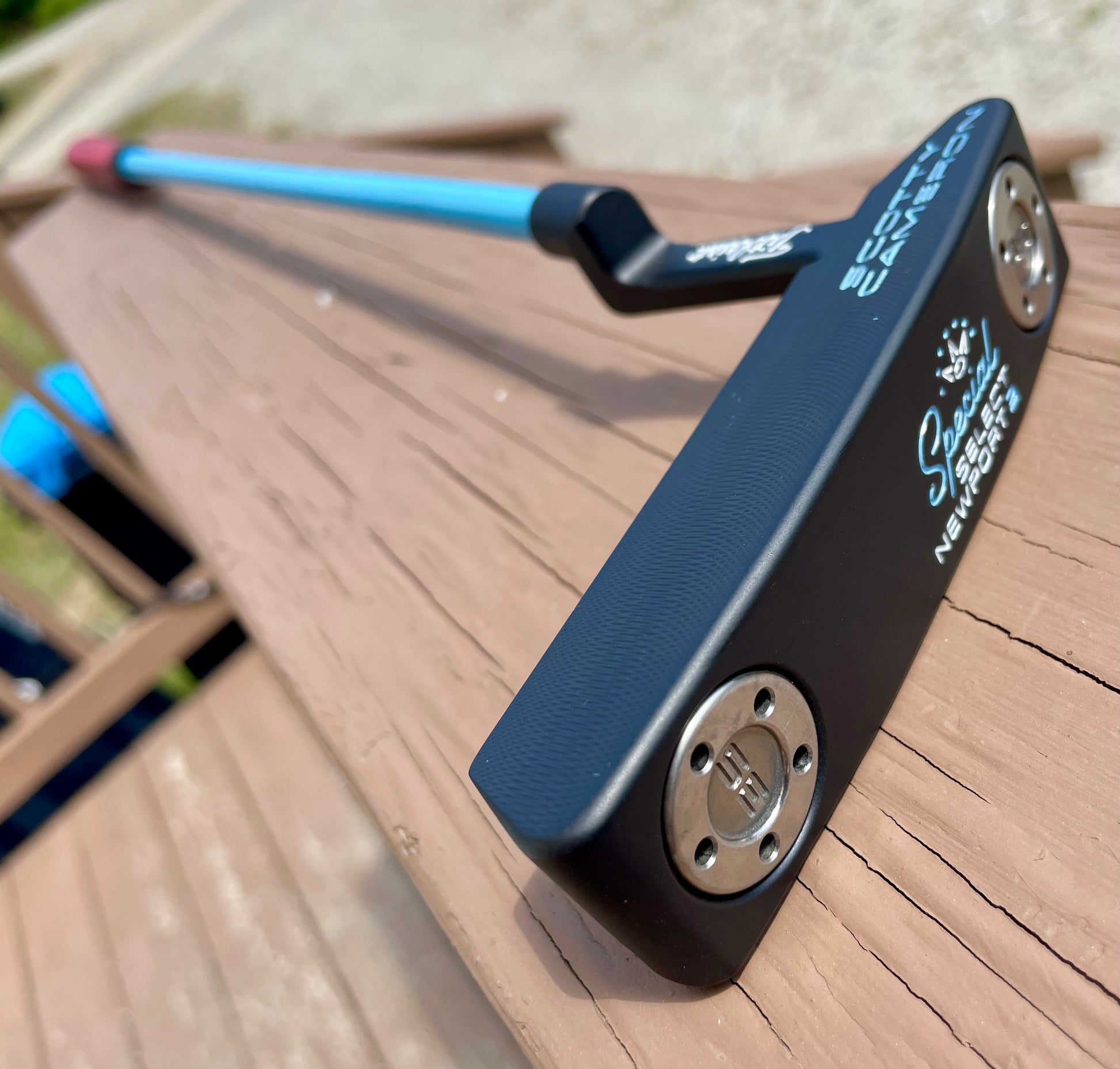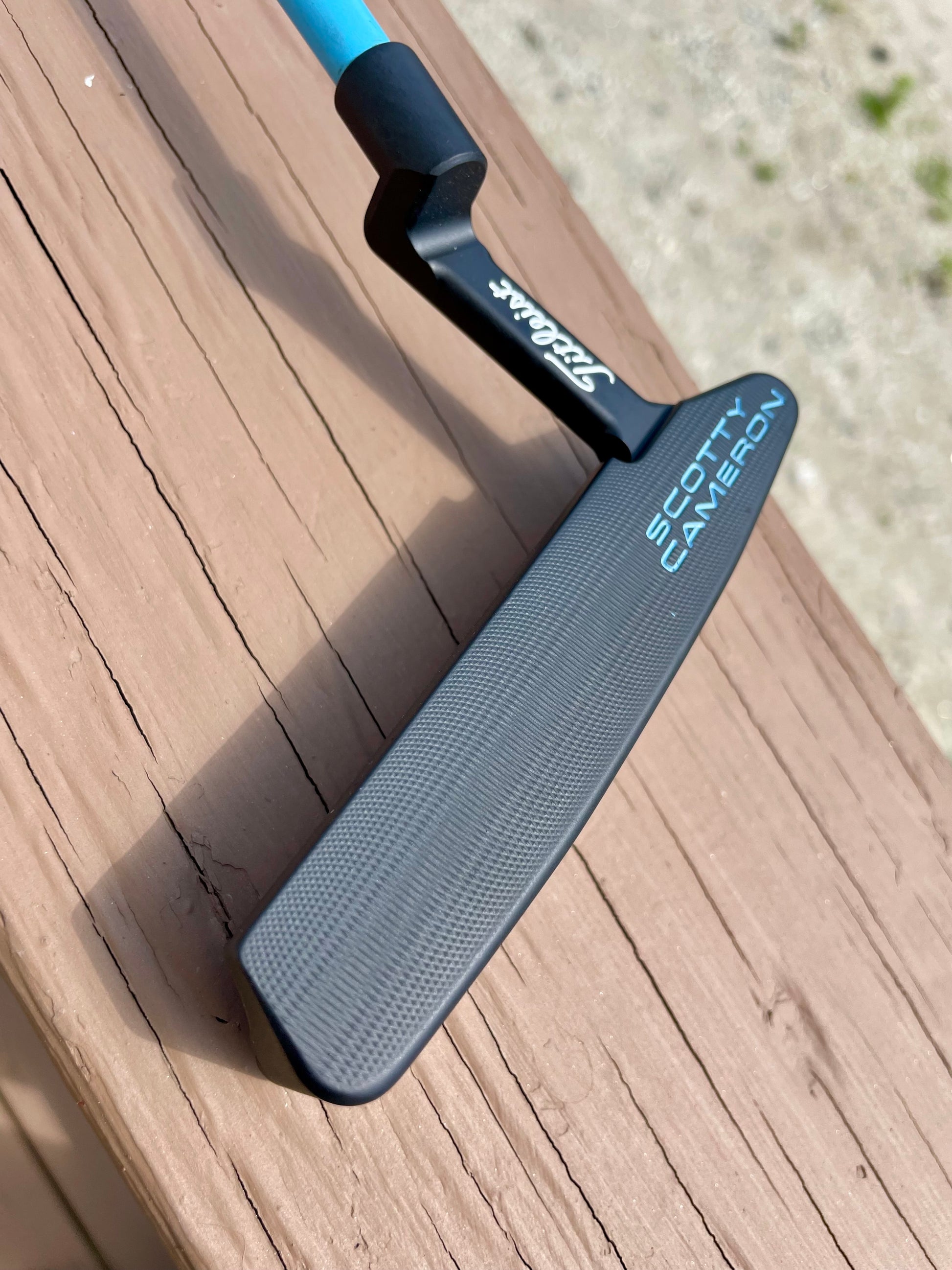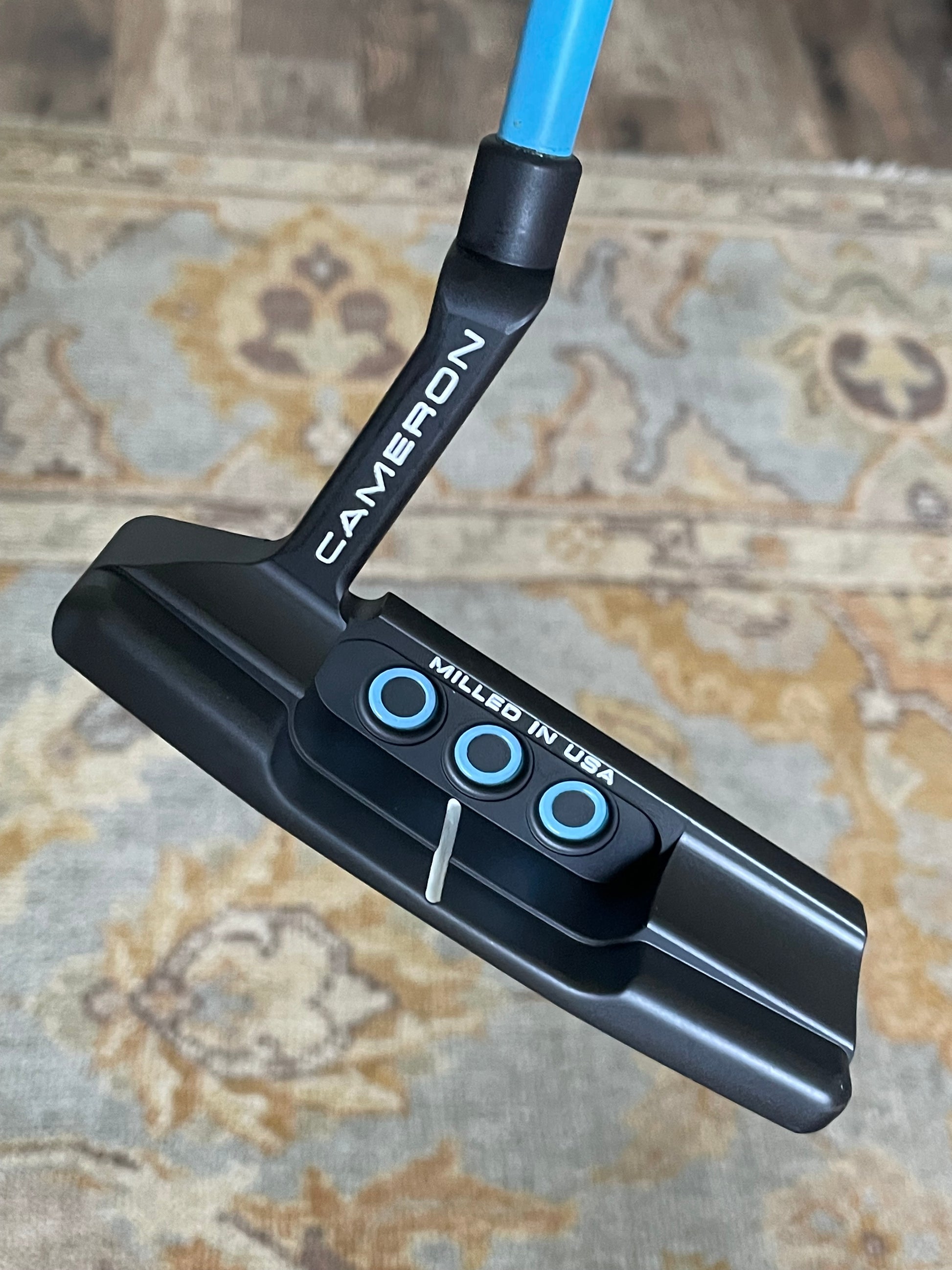 This is a beauty! UNC Blue and gloss white paintfill on a freshly blacked out head. New KBS GPS 120 tour graphite shaft, and a new midsize matador grip from Scotty Cameron. Plays 34" and is weighted accordingly. This is a player's setup!
