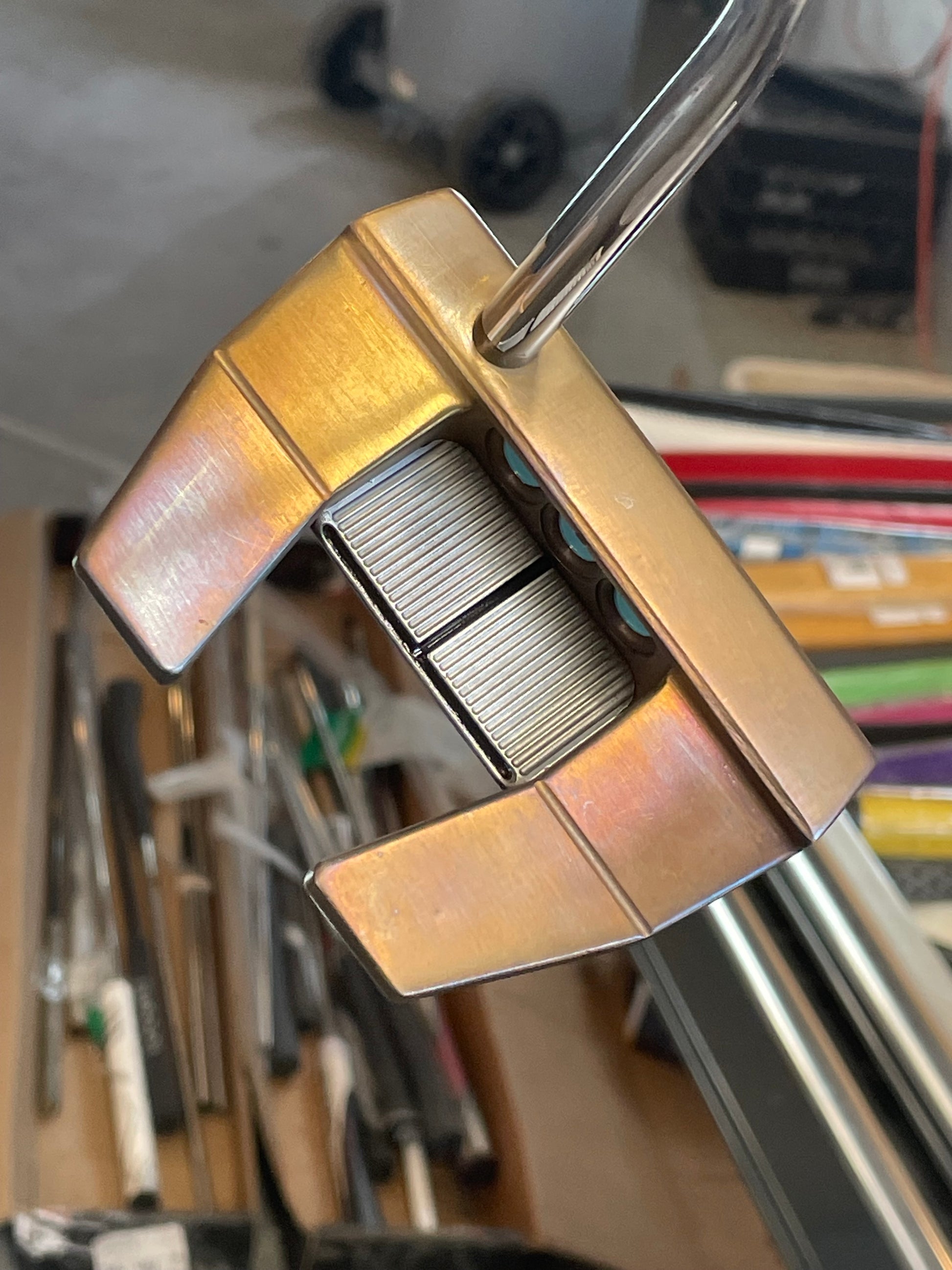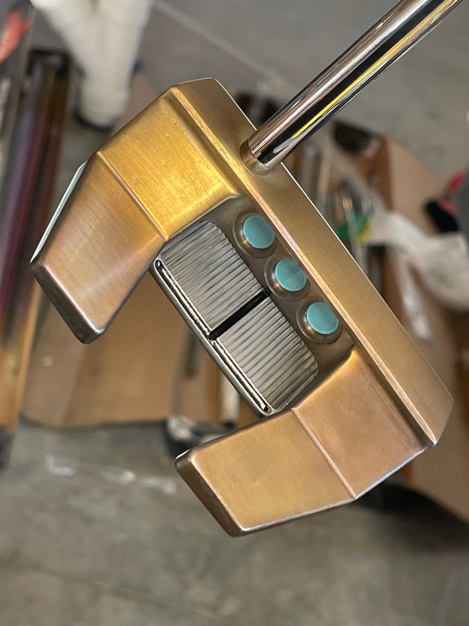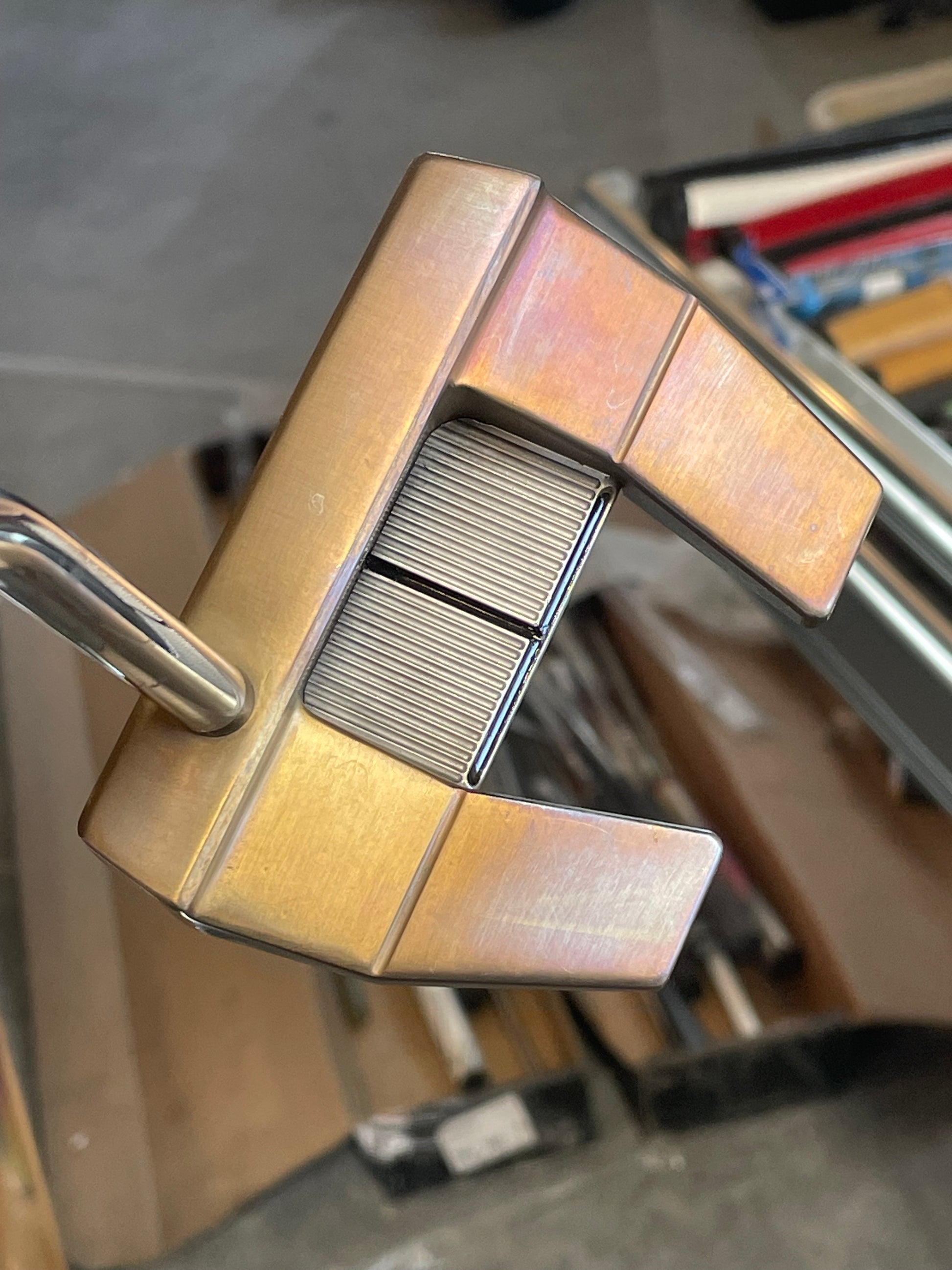 Putter was torched, satin blasted plate, tiffany paint, black acrylic site lines. I didn't paint the lines on the top of the body... to keep it a bit more simple. I will if you'd rather!