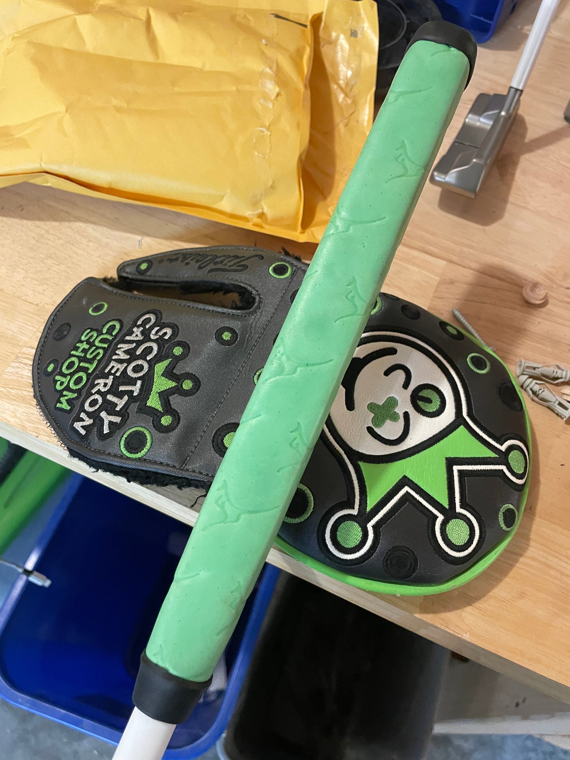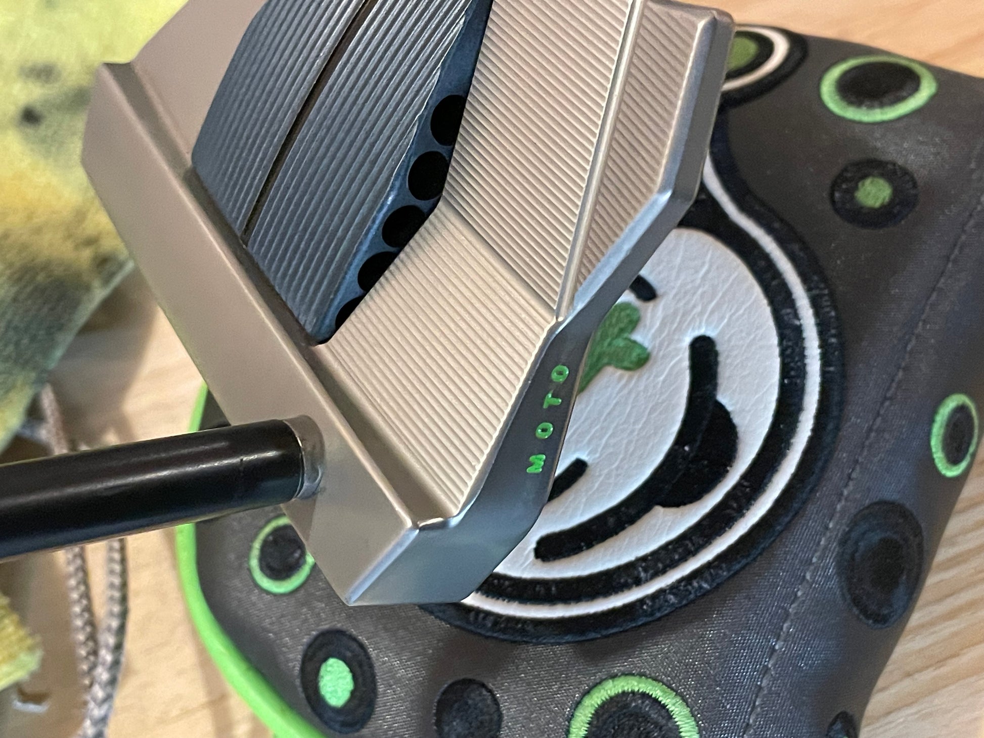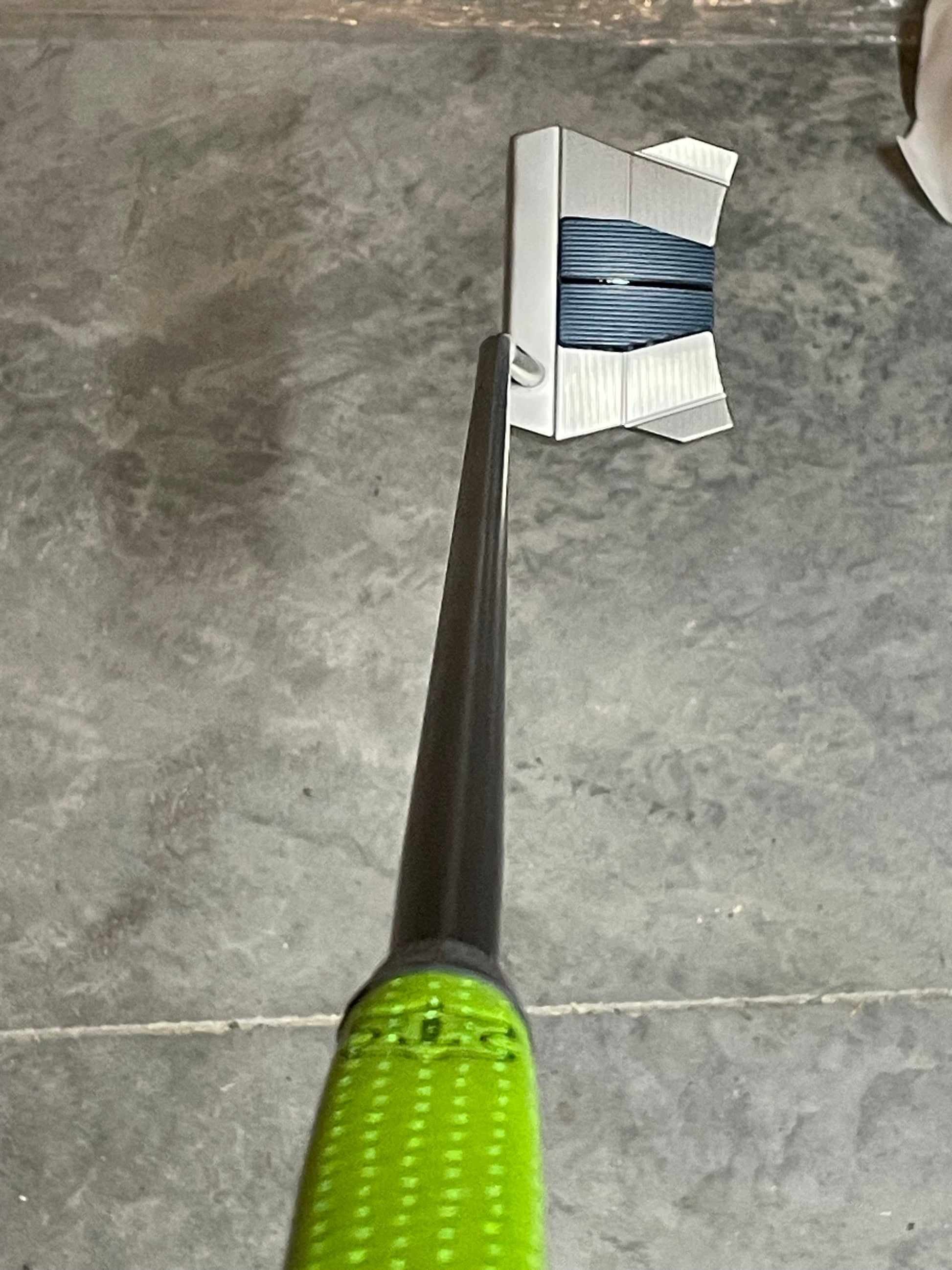 This is a sweet one! A MOTO Monday putter, originally, I took it in and completely rebuilt it. New satin black CT Tour from KBS, and a new lime kangaroo paddle grip from the Gripmaster. These are amazing. Mystic blue centerplate, and a tour satin body, this thing looks super cool!