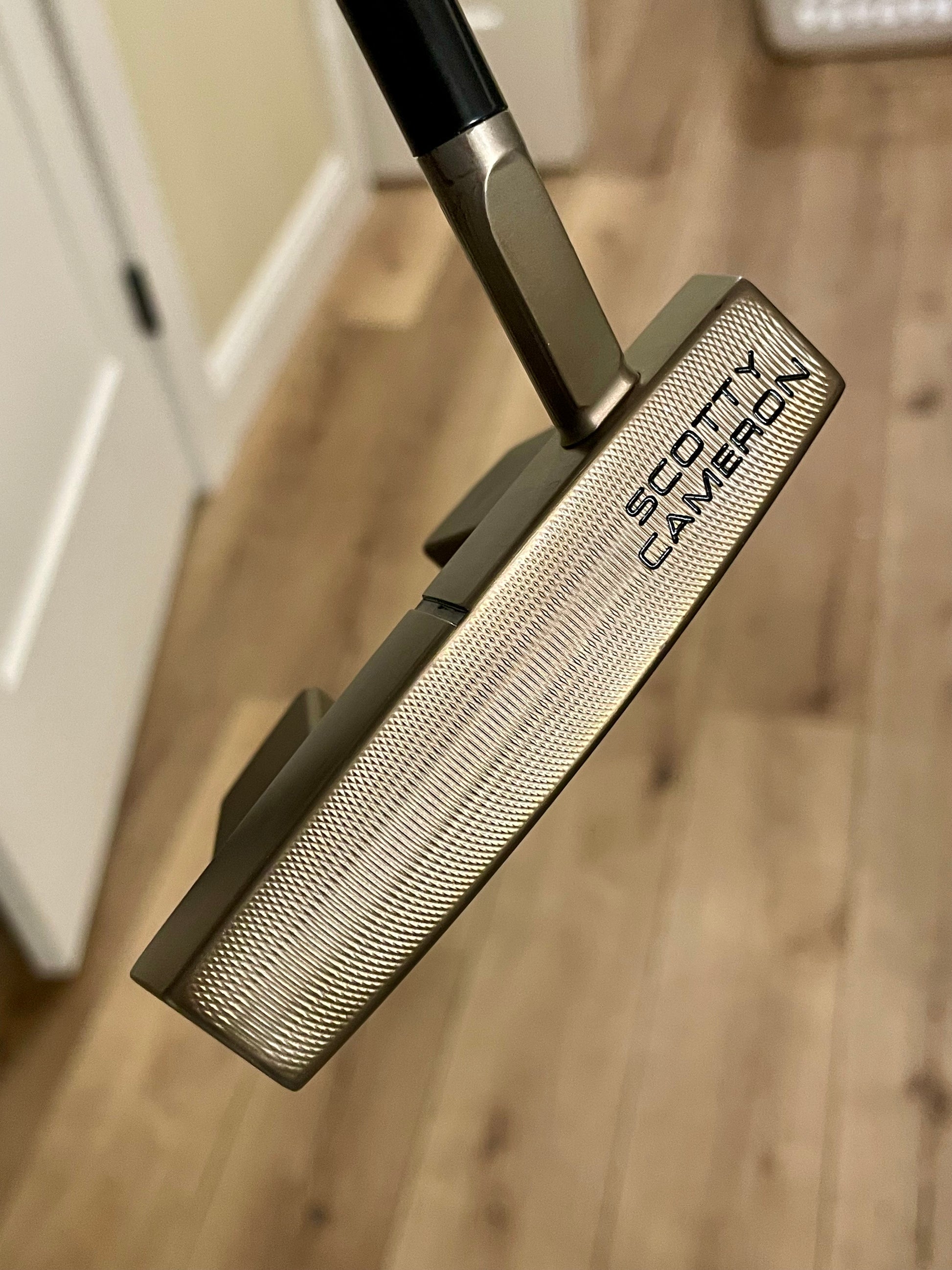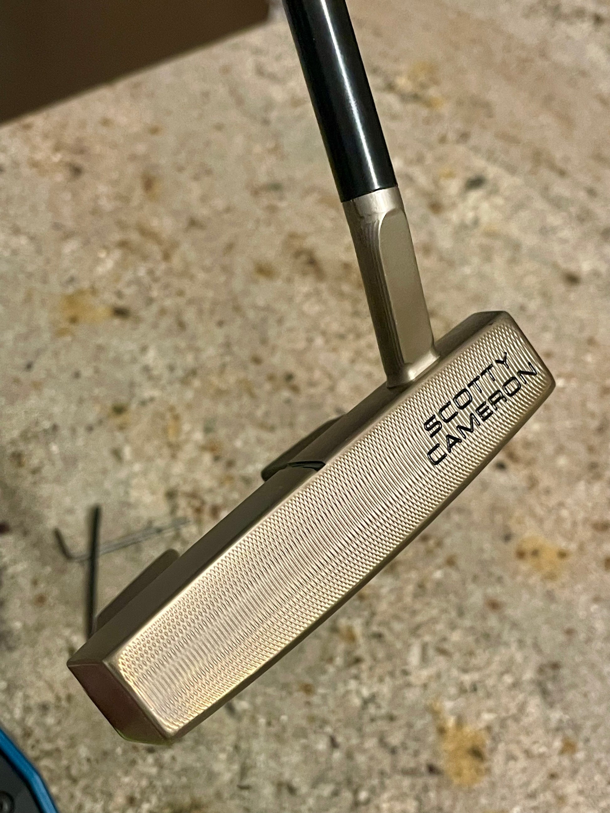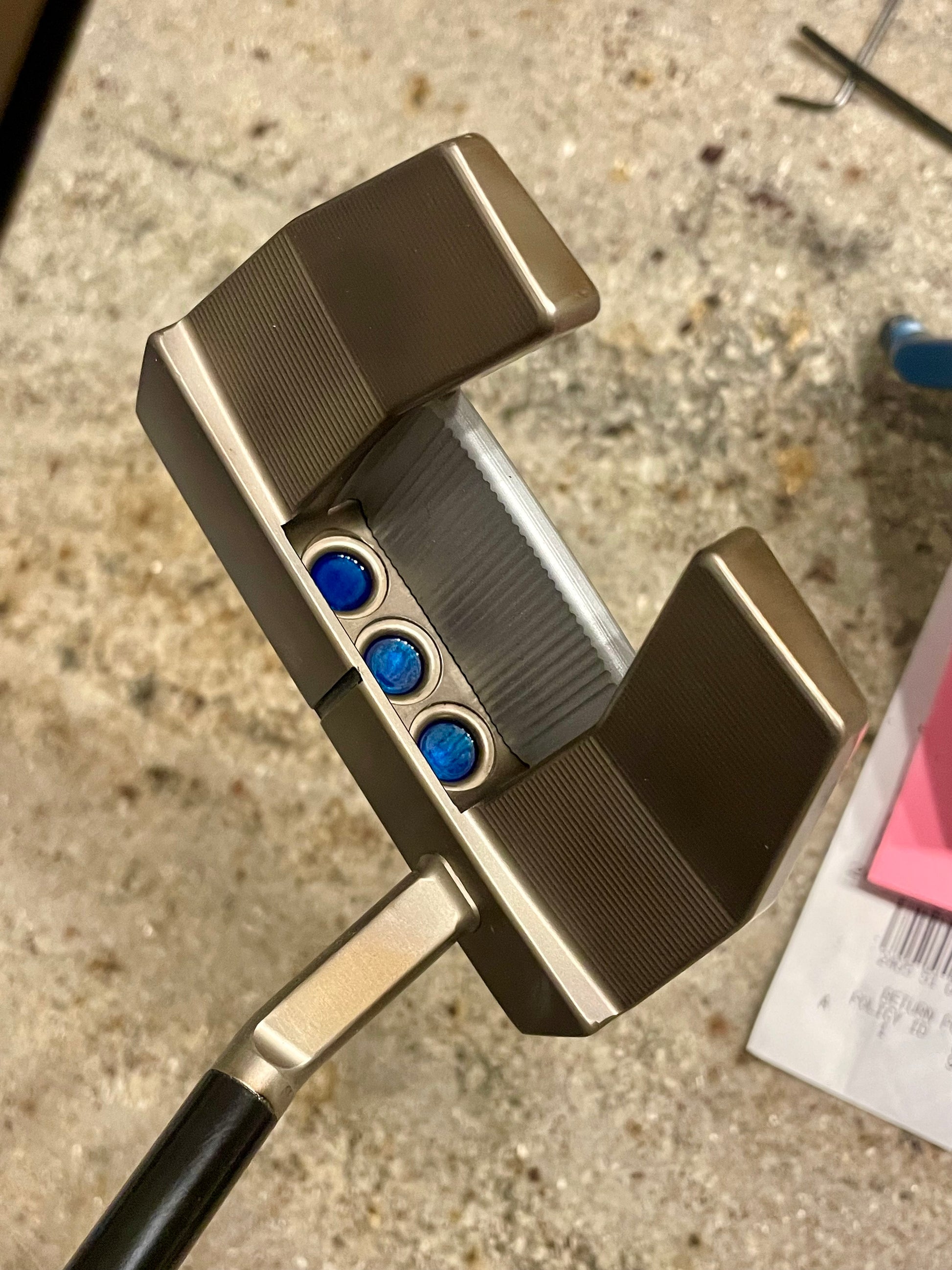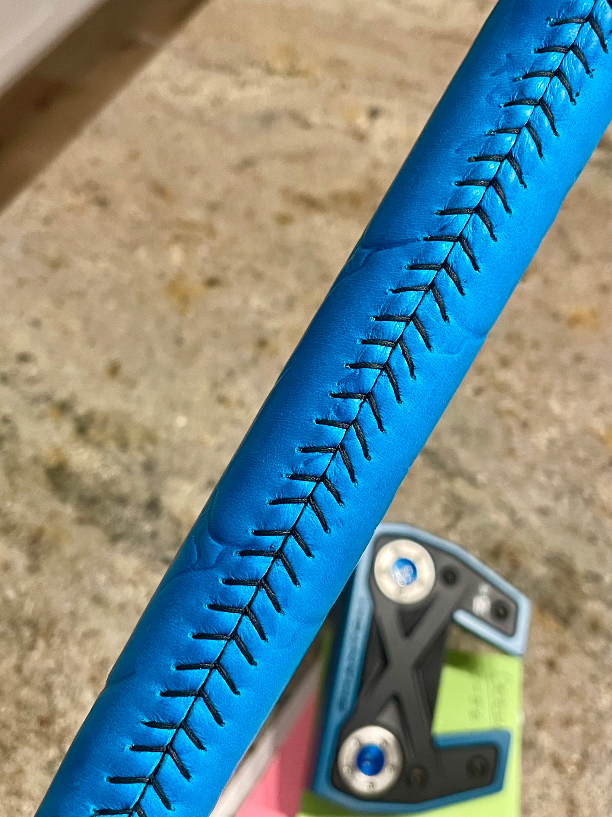 Beautiful setup here. Perfect satin torch (Chromatic bronze) - spotless! New gloss black shaft, kangaroo paddle grip (The Gripmaster) in "aqua" which I love. Matches candy blue paint that pops. Plays 34.5" New original cover included.