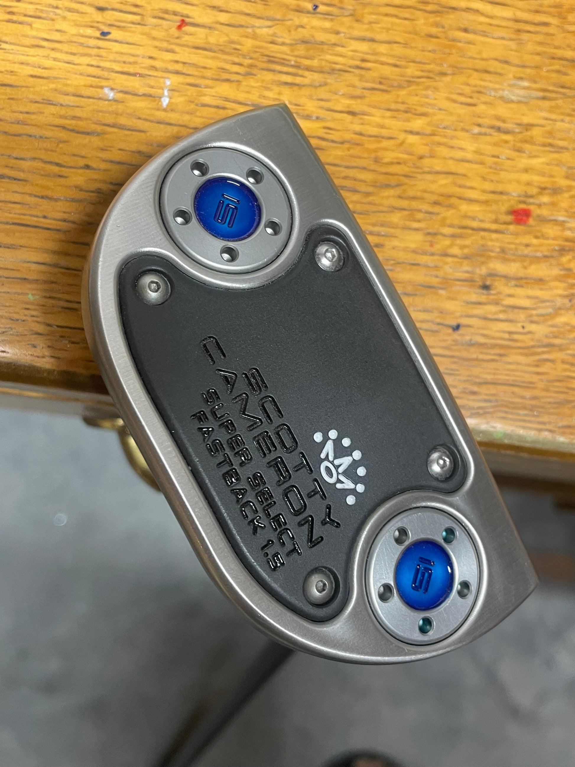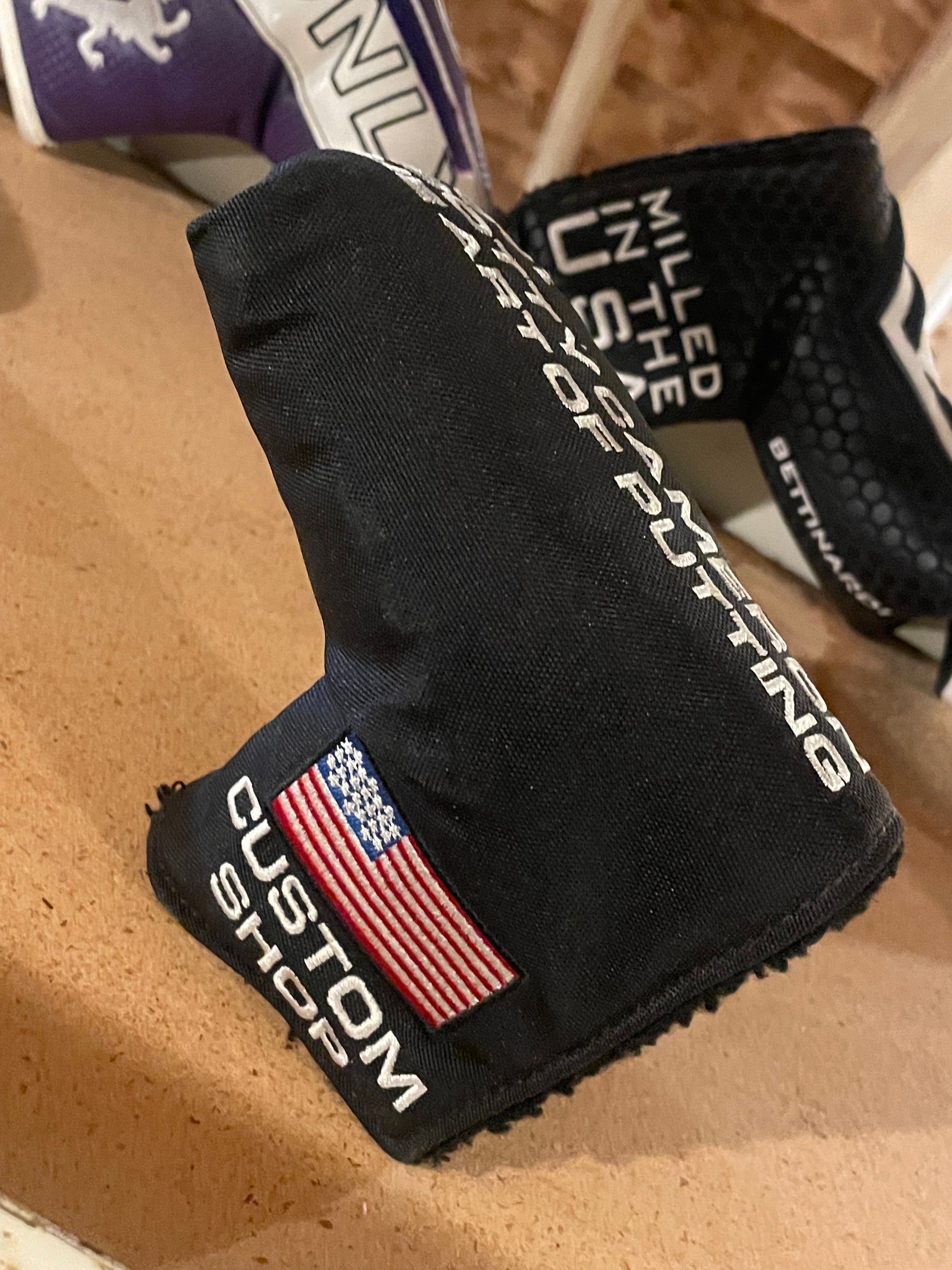 This is a very forgiving shape for the average golfer, and a very nice setup for the pricetag. Putter has been rolled but a few times before me- it's a beauty! Blacked out baseplate matches a matte black shaft perfectly. New Iomic Midsize in "blue army" with a very lightly used custom shop USA headcover- velcro is as new! Sweet combo for the price! And you won't see another like it.