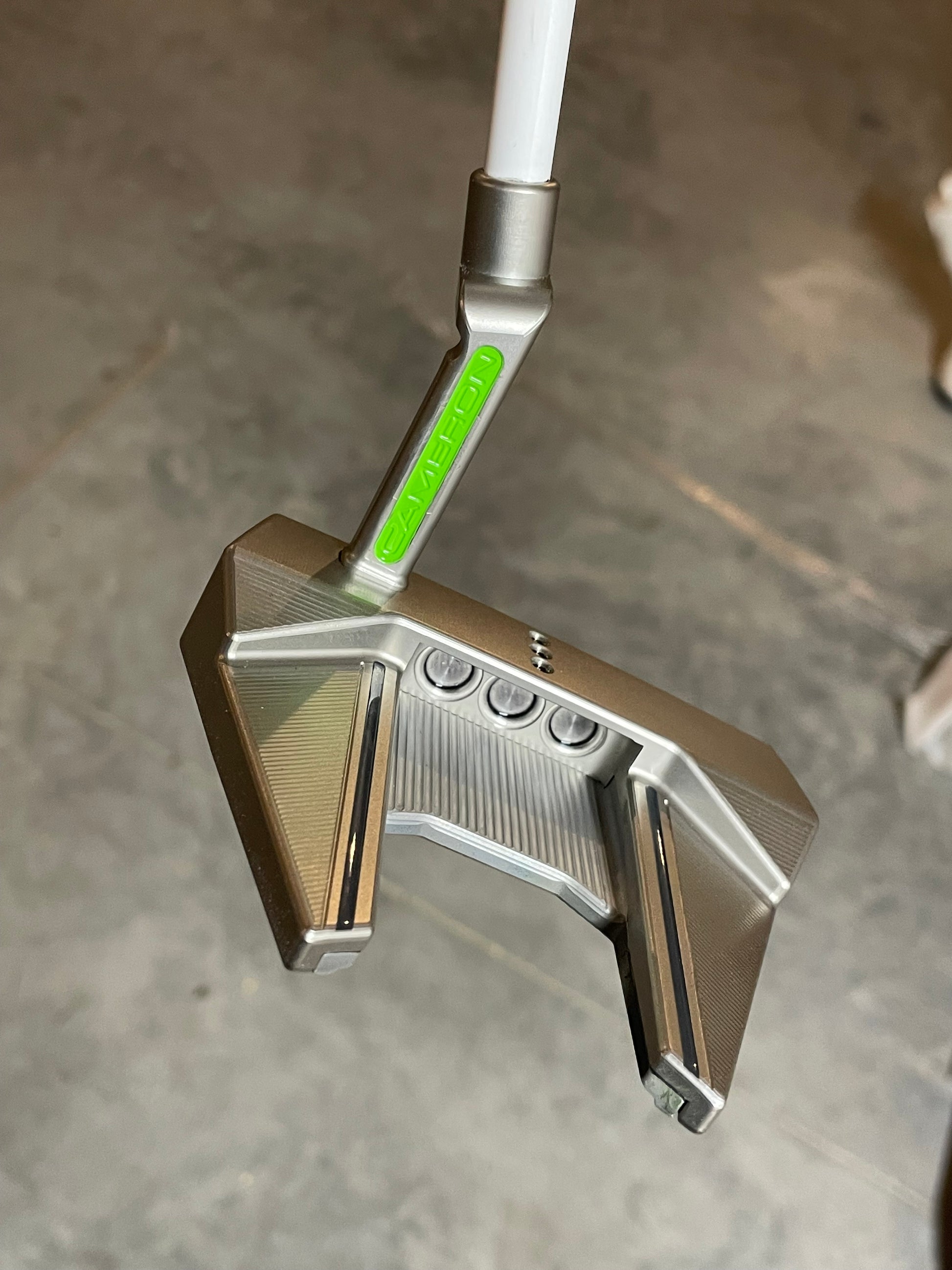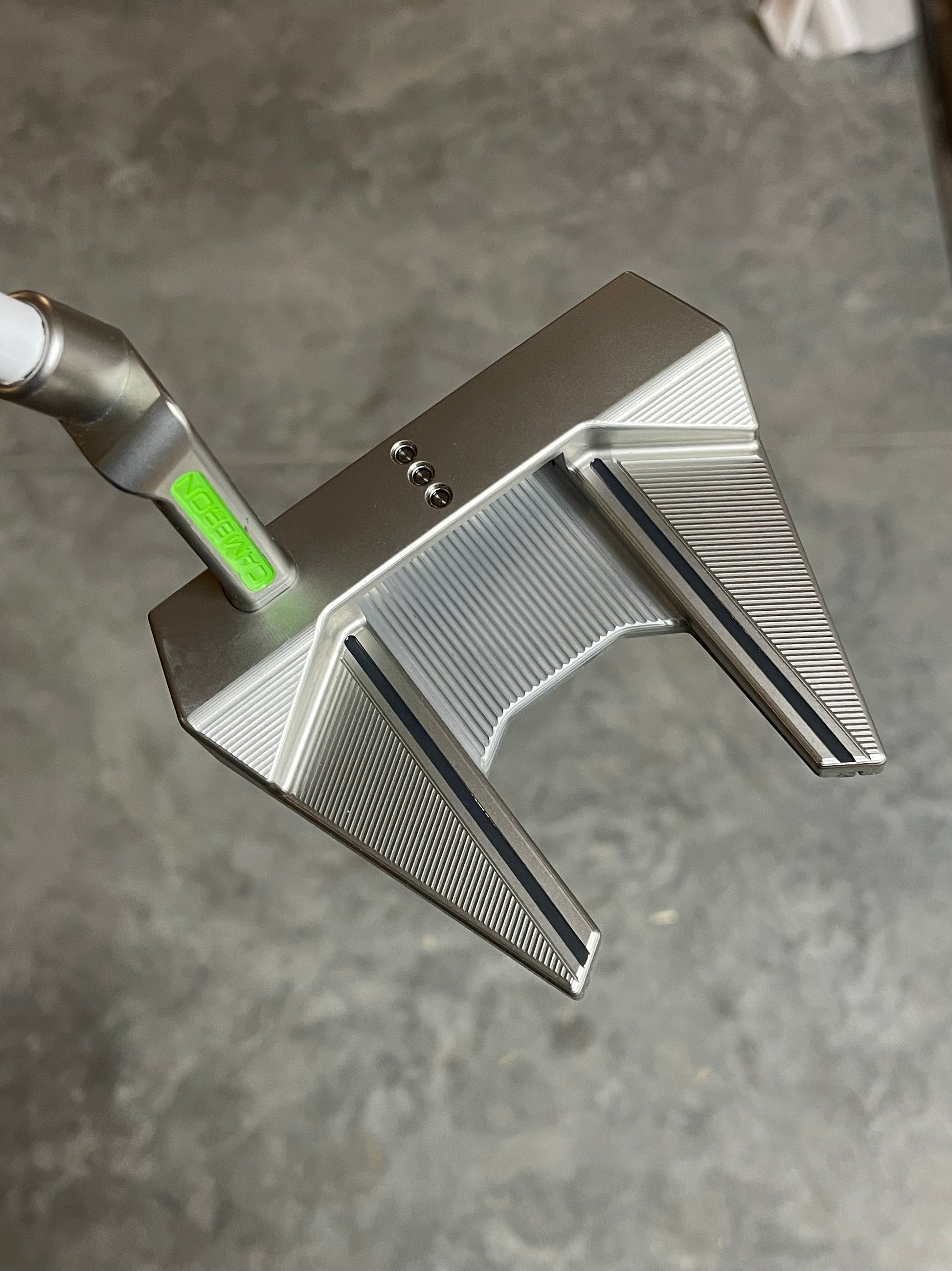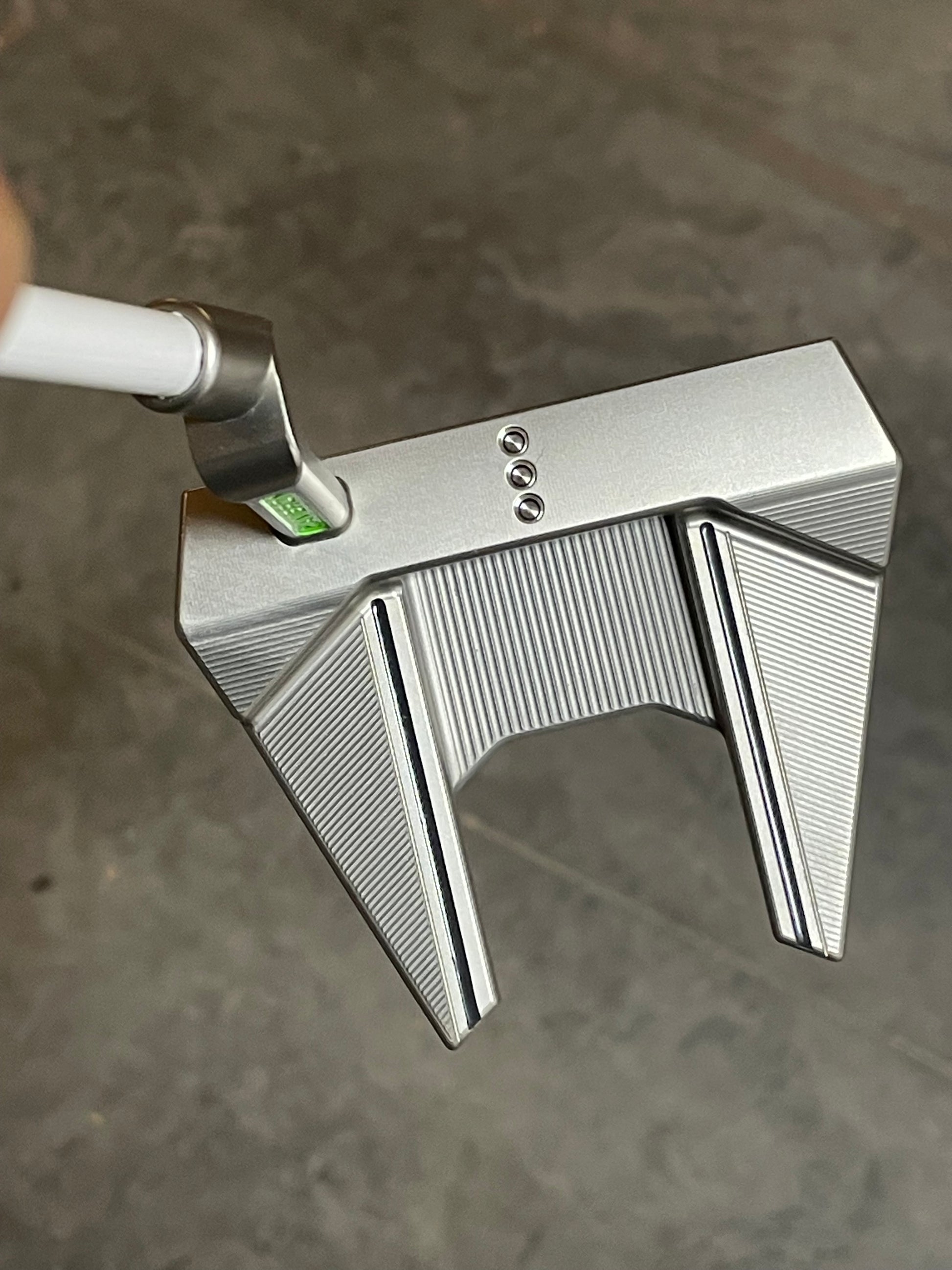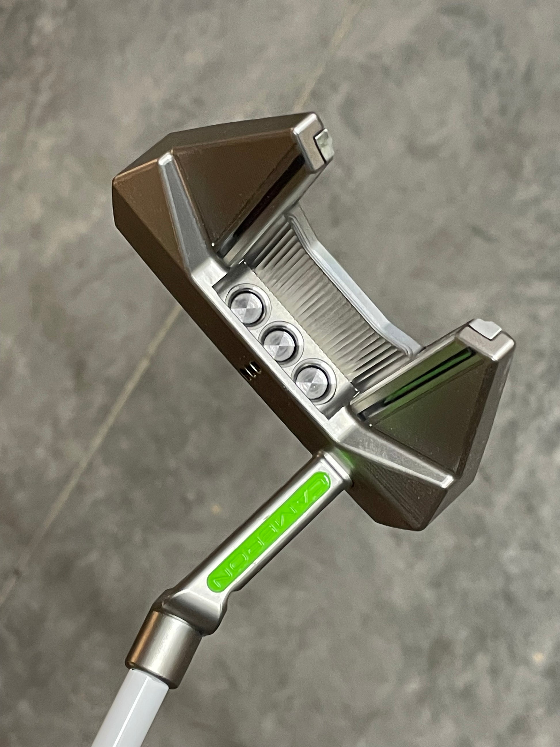 This Plummer's neck phantom line is new for 2024-25. And they are awesome. This putter is in like-new condition. Double satin finish (by me!) and lime gloss fills match a Kangaroo paddle grip from Gripmaster. These are SO nice and soft, but the actually last. Don't miss this one!