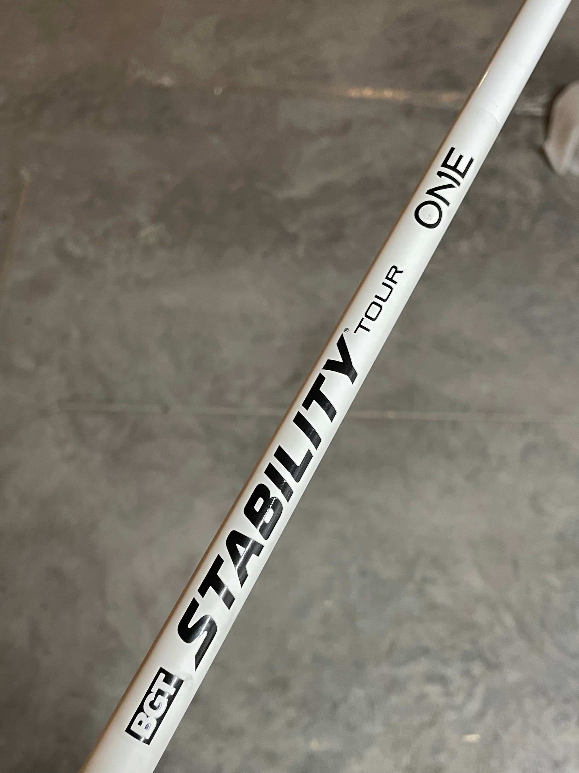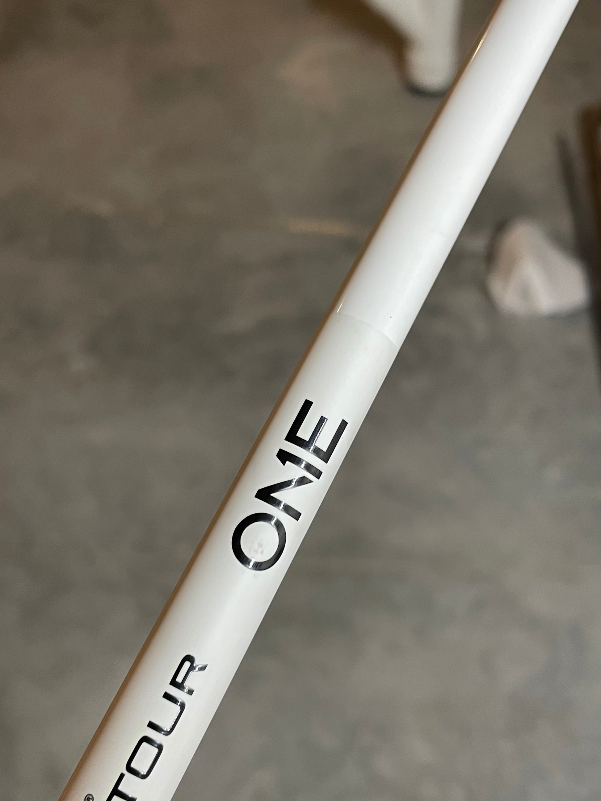 This is a NICE setup. One-piece white graphite shaft from BGT is the absolute top of the line in stability / reduced shaft chatter and dispersion. This shaft retails around $3-400. These also look great. Gloss white on the bottom, matte white on top.
