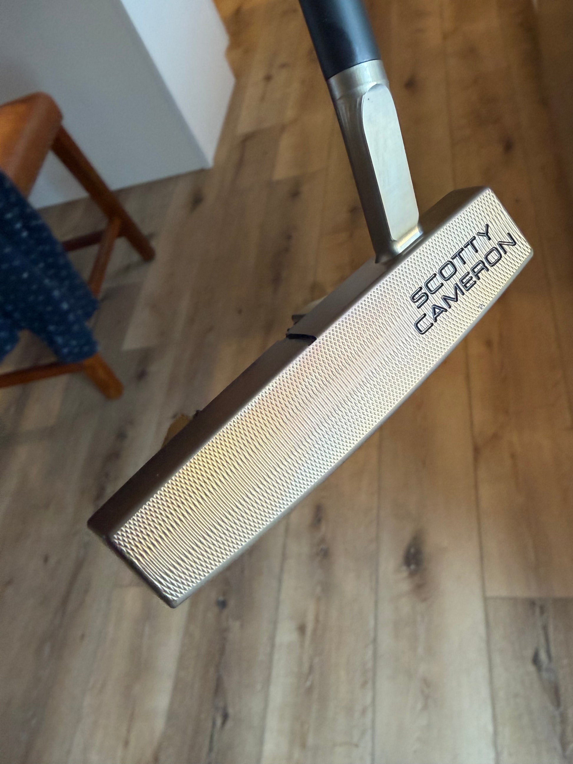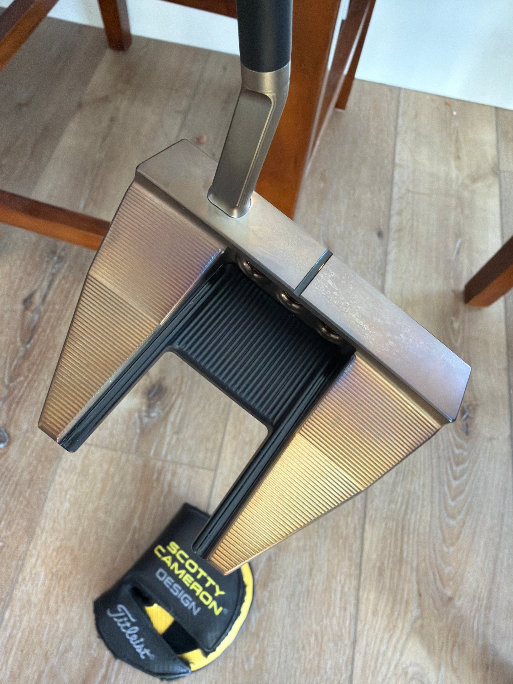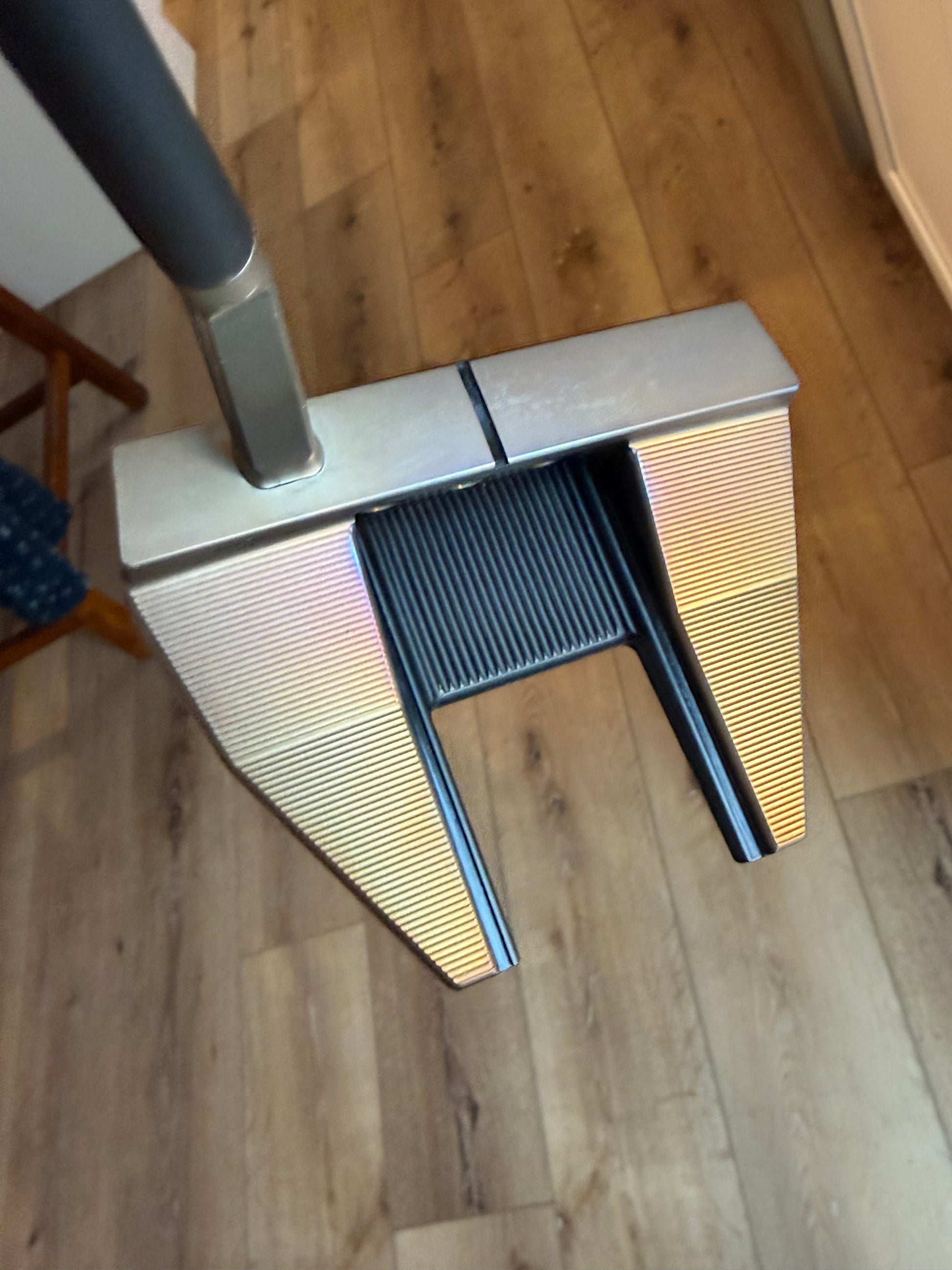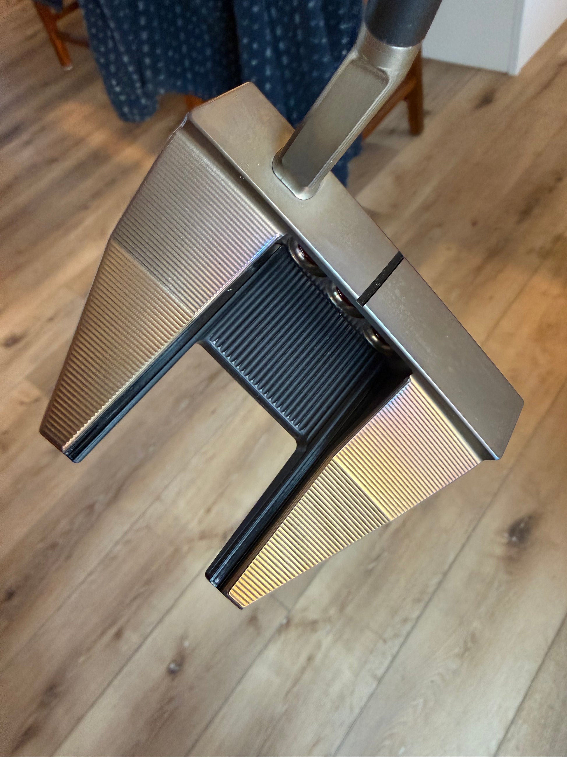 torched past chromatic bronze, rested like a nice steak, and torched some more. Blue, purple, and a little bit of oil marking from the steel- Amazing organic color. Much better in person. Beautiful putter.