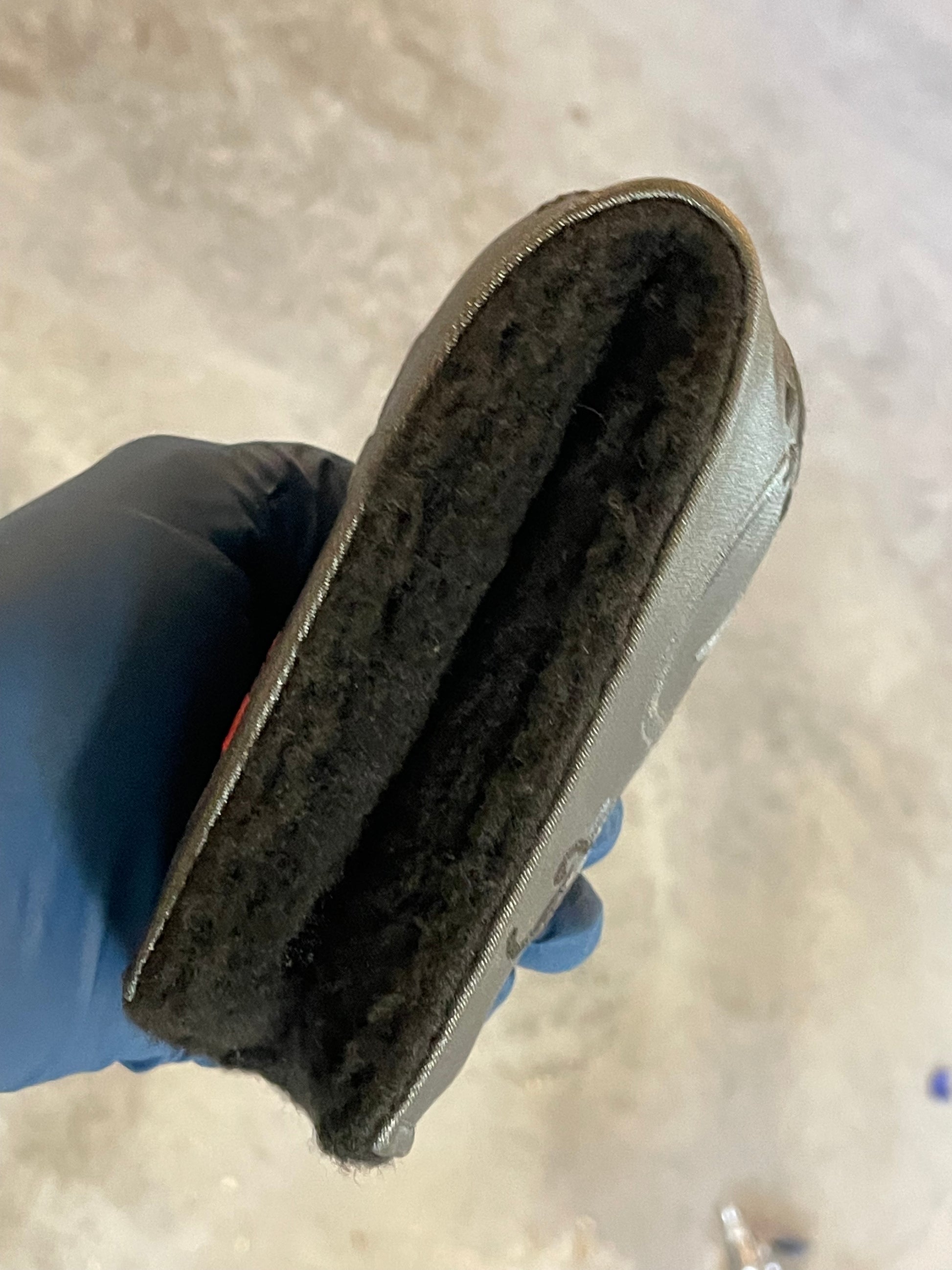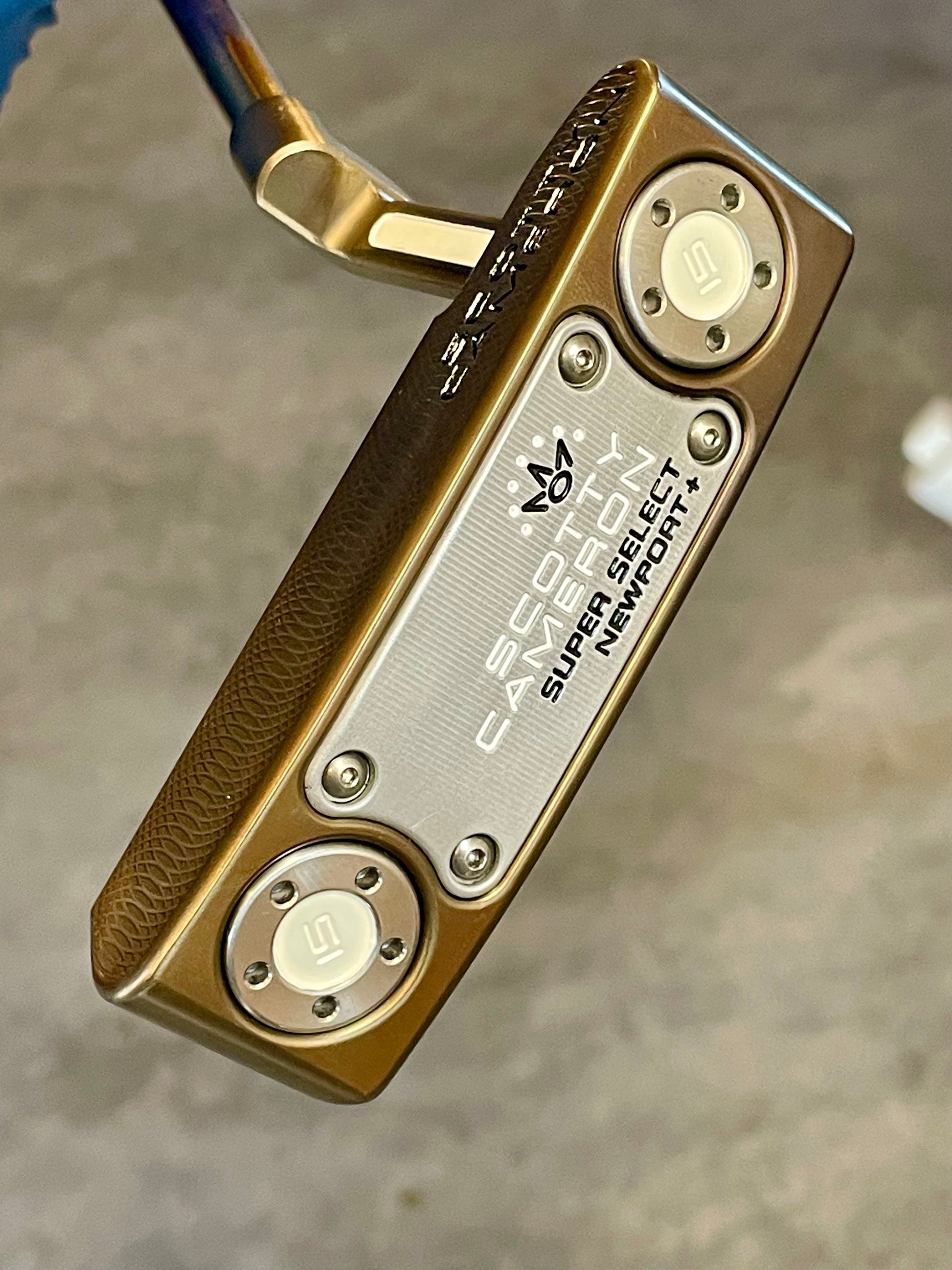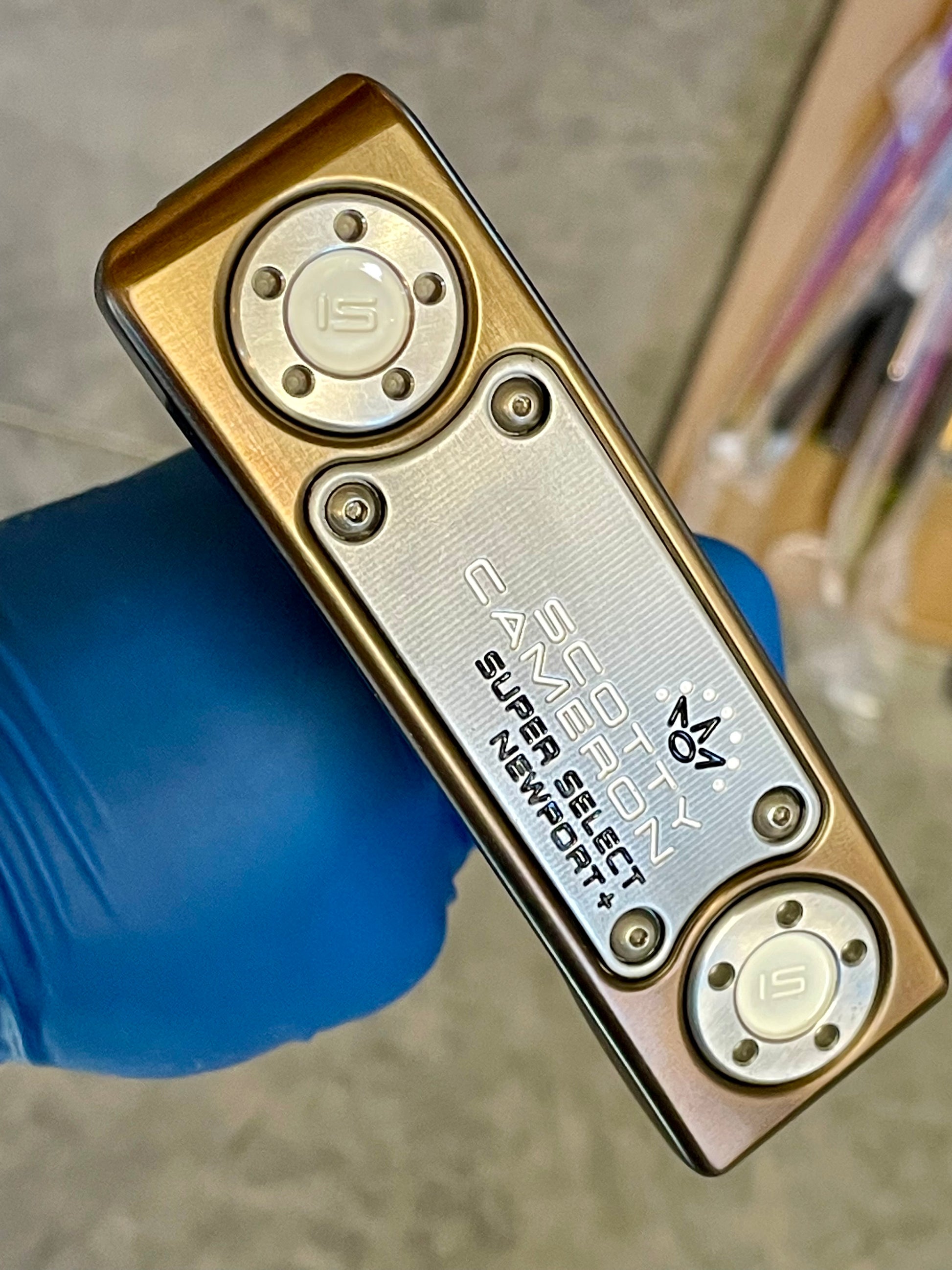 This putter spared nothing! Kangaroo leather paddle grip in "chamois" matches the gold end of this rainbow KBS GPS 120 graphite shaft. Baseplate was blasted and brushed- no coating - for an aged aluminum look. Black and aged white gloss paintfill, which really pops out of this colorful head! Plays 34.5" and weighted for 34, so this one feels nice and solid!